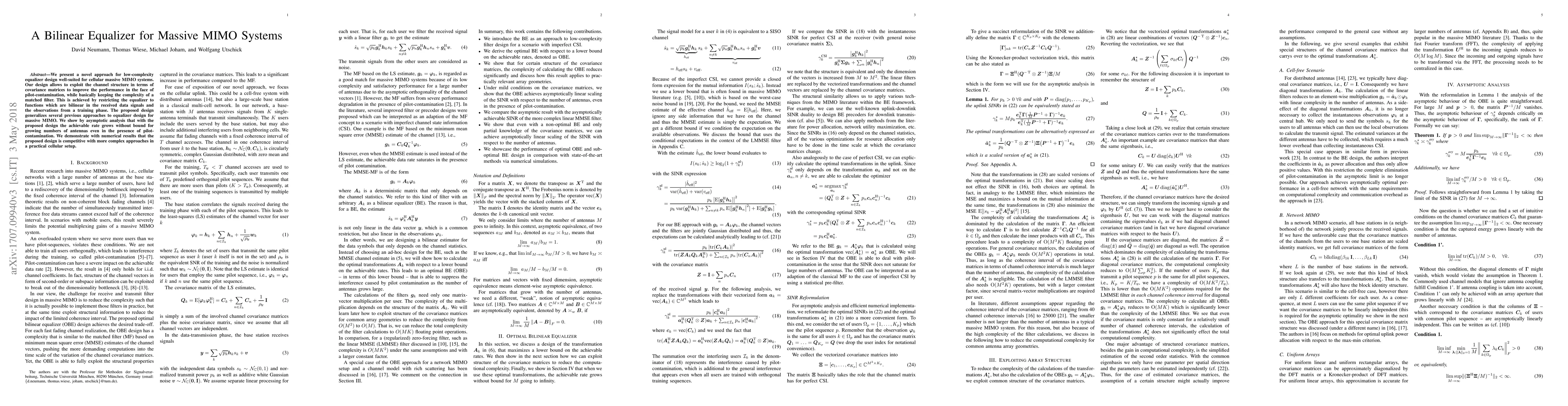 We present a novel approach for low-complexity equalizer design well-suited for cellular massive MIMO systems. Our design allows to exploit the channel structure in terms of covariance matrices to improve the performance in the face of pilot-contamination, while basically keeping the complexity of a matched filter. This is achieved by restricting the equalizer to functions which are bilinear in the received data signals and the observations from a training phase. The proposed design generalizes several previous approaches to equalizer design for massive MIMO. We show by asymptotic analysis that with the proposed design the achievable rate grows without bound for growing numbers of antennas even in the presence of pilot-contamination. We demonstrate with numerical results that the proposed design is competitive with more complex approaches in a practical cellular setup.