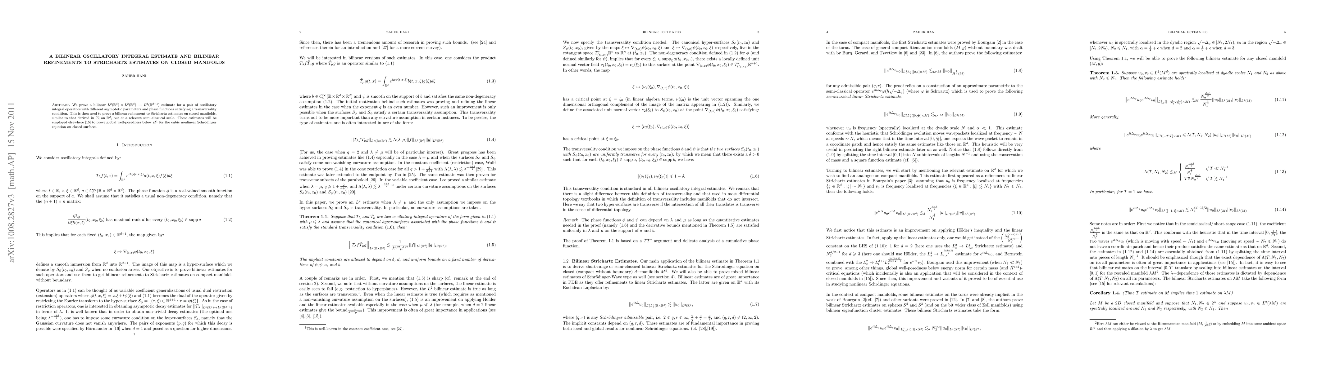 The paper establishes a bilinear oscillatory integral estimate and uses it to refine Strichartz estimates on closed manifolds at a semi-classical scale, which is further applied to prove global well-posedness for the cubic nonlinear Schrödinger equation on such surfaces.