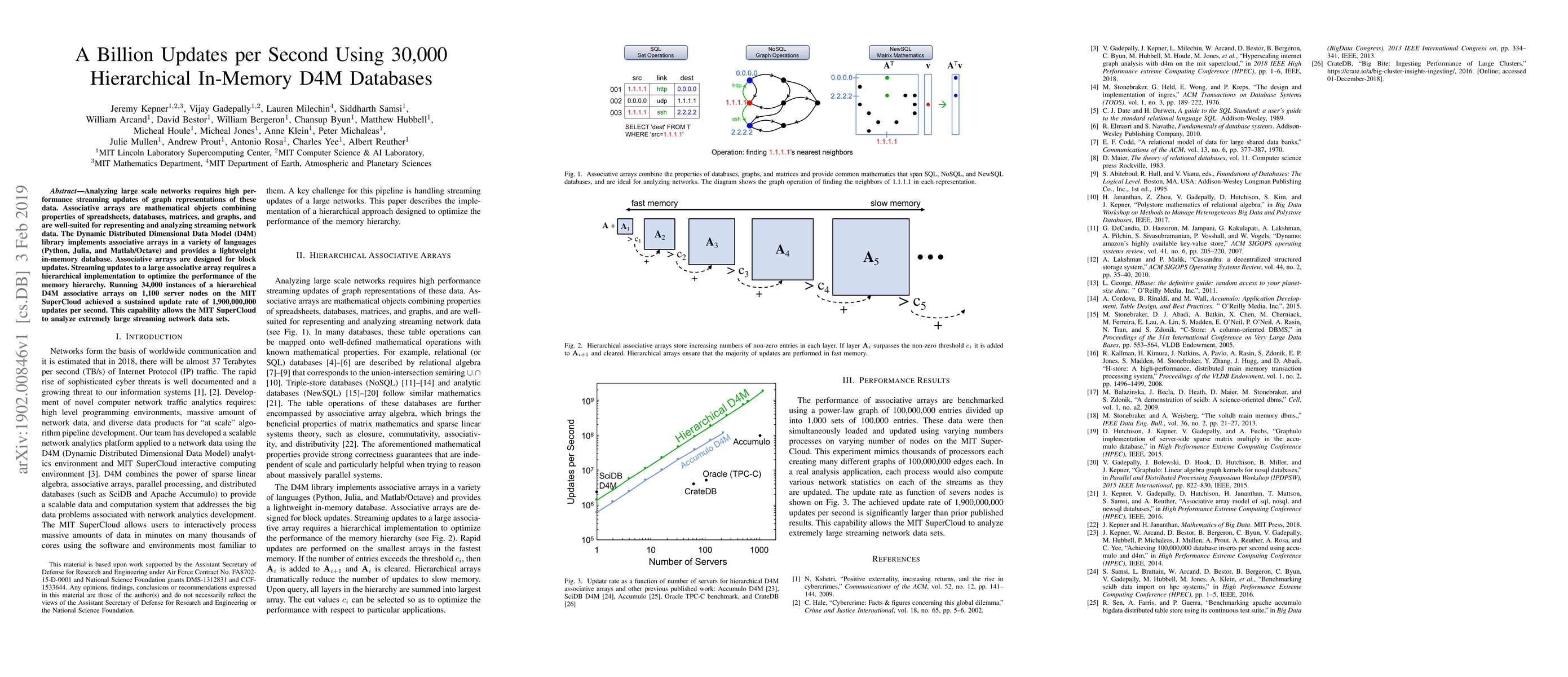 This paper presents a high-performance streaming update system using 34,000 hierarchical in-memory D4M associative arrays on 1,100 server nodes, achieving a sustained update rate of 1.9 billion updates per second. This capability enables the MIT SuperCloud to efficiently analyze large-scale streaming network data.