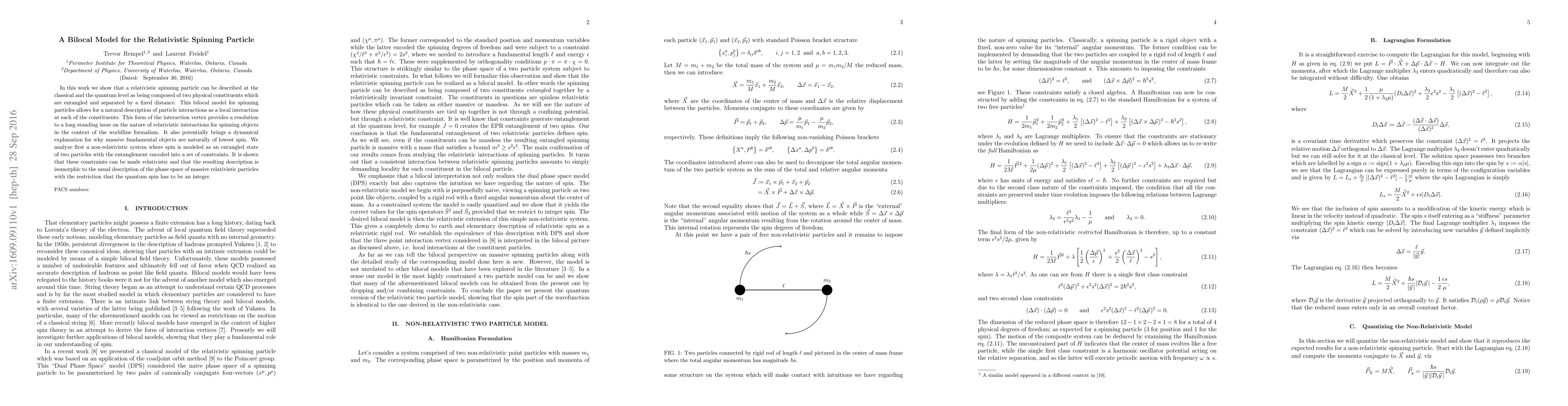 This paper proposes a bilocal model for relativistic spinning particles, describing them as two entangled constituents separated by a fixed distance. This model resolves longstanding issues regarding relativistic interactions and offers a dynamical explanation for the natural occurrence of lowest spin in massive fundamental particles.