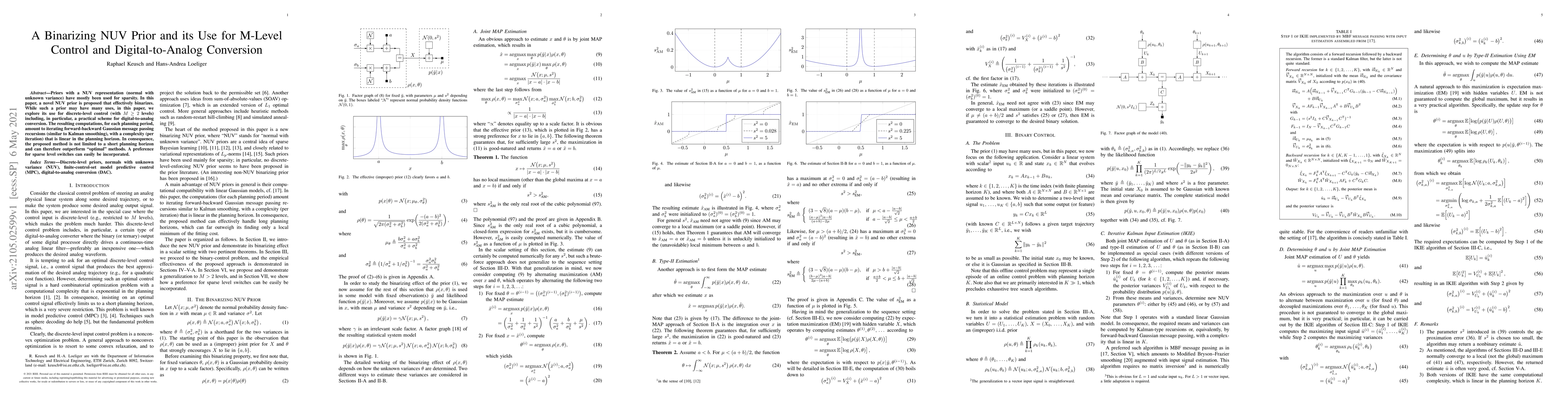 Priors with a NUV representation (normal with unknown variance) have mostly been used for sparsity. In this paper, a novel NUV prior is proposed that effectively binarizes. While such a prior may have many uses, in this paper, we explore its use for discrete-level control (with M $\geq$ 2 levels) including, in particular, a practical scheme for digital-to-analog conversion. The resulting computations, for each planning period, amount to iterating forward-backward Gaussian message passing recursions (similar to Kalman smoothing), with a complexity (per iteration) that is linear in the planning horizon. In consequence, the proposed method is not limited to a short planning horizon and can therefore outperform "optimal" methods. A preference for sparse level switches can easily be incorporated.
