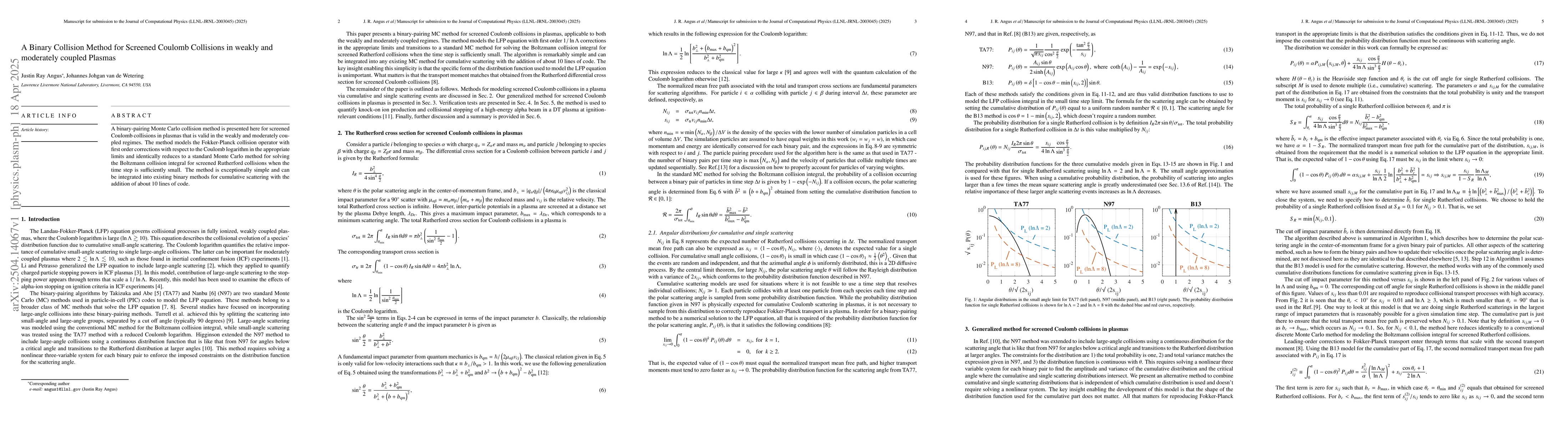 The paper introduces a novel binary-pairing Monte Carlo method for screened Coulomb collisions in plasmas, which includes first-order 1/lnΛ corrections to Fokker-Planck transport and can be easily integrated into existing simulation codes.