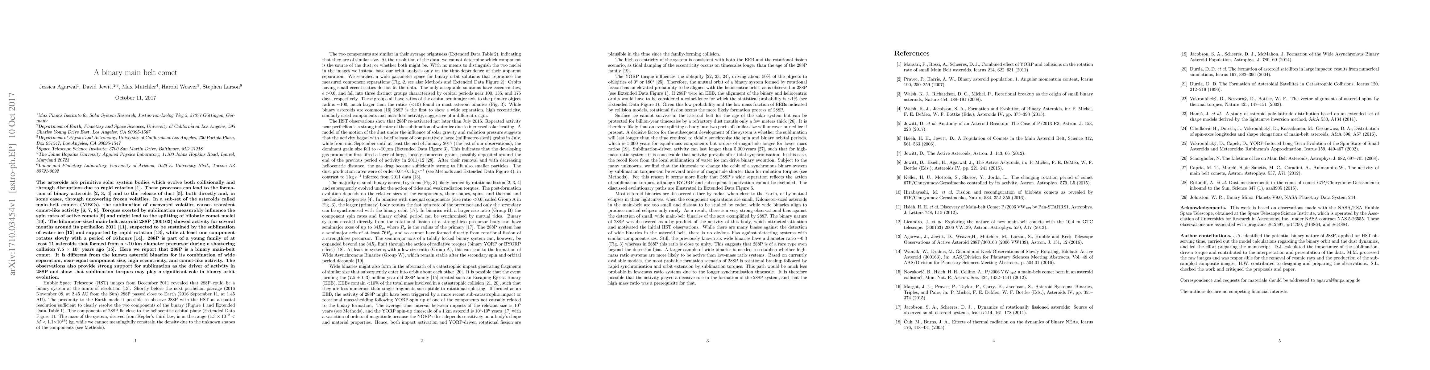 The paper reports that the main-belt asteroid 288P (300163) exhibits comet-like activity due to the sublimation of water ice, and is identified as a unique binary main-belt comet characterized by wide separation, near-equal component sizes, high eccentricity, and sublimation-driven activity.