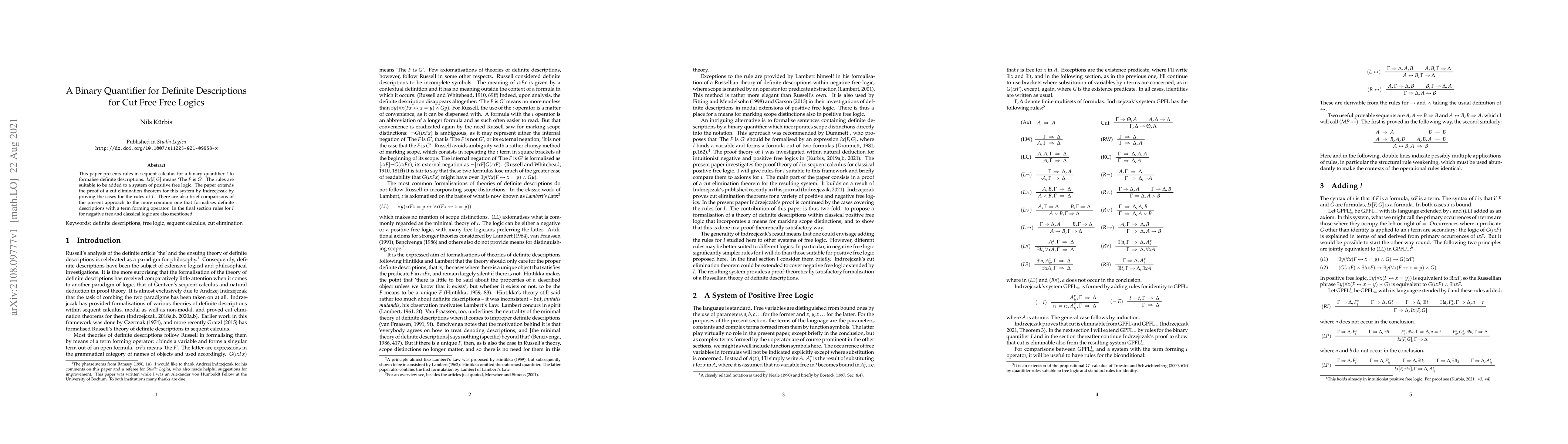This paper introduces sequent calculus rules for a binary quantifier $I$ to formalise definite descriptions in free logics, extending Indrzejczak's cut elimination theorem. It also briefly compares this approach with term forming operators and mentions rules for negative free and classical logic.