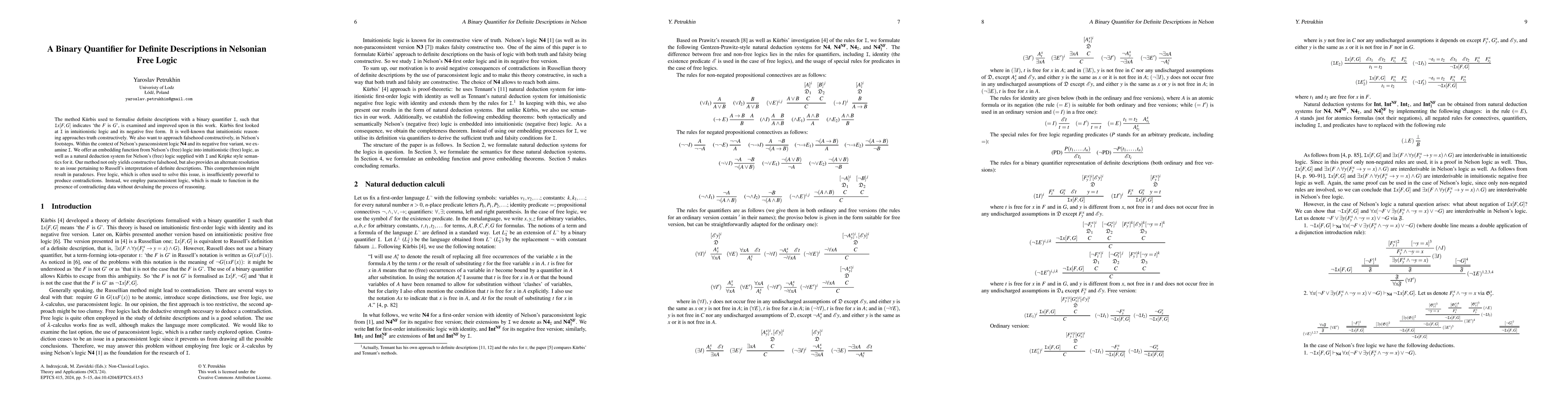 This paper improves on Kűrbis's method for formalizing definite descriptions using a binary quantifier in Nelsonian free logic. It integrates Nelson's paraconsistent logic to constructively handle both truth and falsehood, providing a resolution to Russell's paradox and offering a more powerful framework than free logic alone.