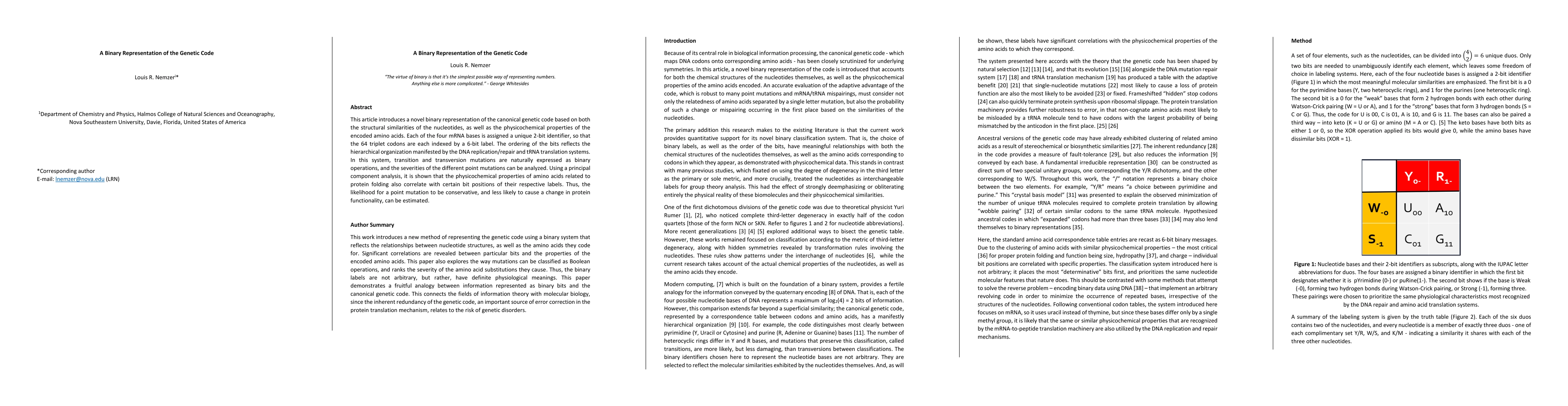 This paper proposes a binary representation of the genetic code that encodes nucleotides and amino acids' physicochemical properties, allowing for analysis of mutation severities and prediction of protein folding impacts based on principal component analysis. The hierarchical representation aligns with DNA replication and translation processes.
