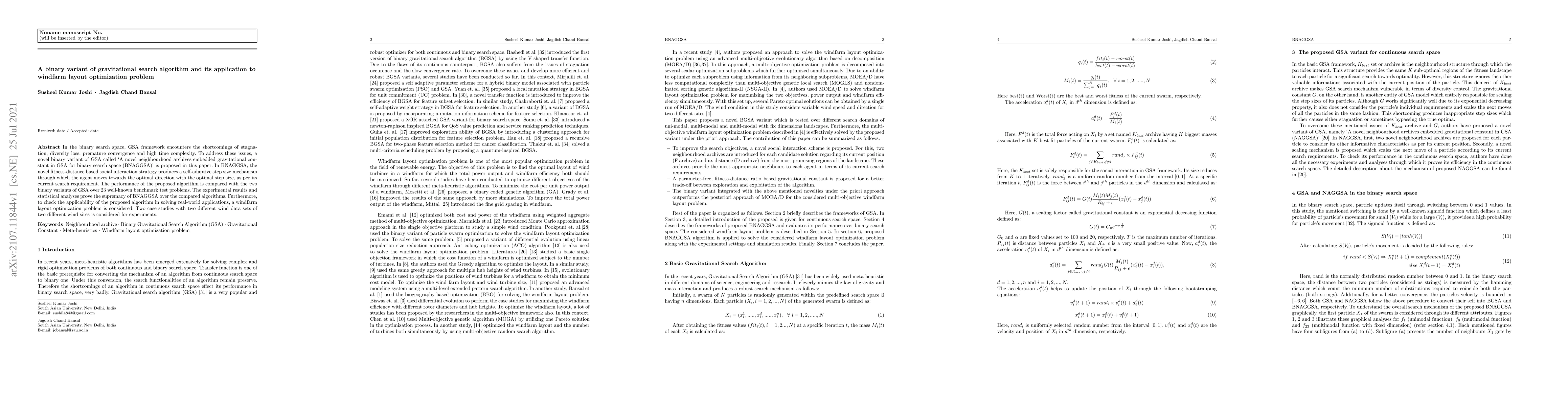 In the binary search space, GSA framework encounters the shortcomings of stagnation, diversity loss, premature convergence and high time complexity. To address these issues, a novel binary variant of GSA called `A novel neighbourhood archives embedded gravitational constant in GSA for binary search space (BNAGGSA)' is proposed in this paper. In BNAGGSA, the novel fitness-distance based social interaction strategy produces a self-adaptive step size mechanism through which the agent moves towards the optimal direction with the optimal step size, as per its current search requirement. The performance of the proposed algorithm is compared with the two binary variants of GSA over 23 well-known benchmark test problems. The experimental results and statistical analyses prove the supremacy of BNAGGSA over the compared algorithms. Furthermore, to check the applicability of the proposed algorithm in solving real-world applications, a windfarm layout optimization problem is considered. Two case studies with two different wind data sets of two different wind sites is considered for experiments.