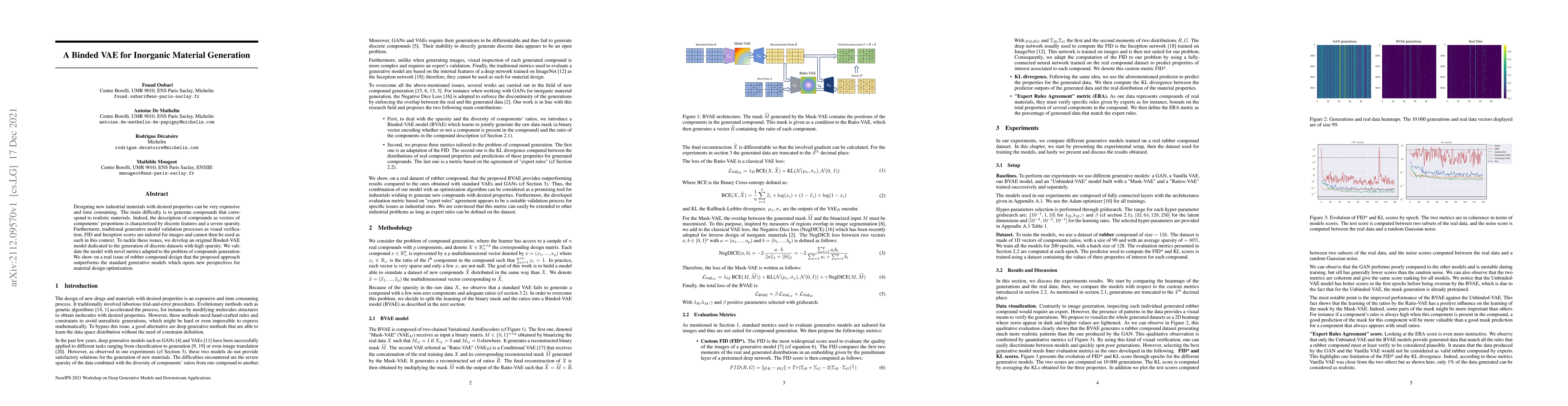 This paper introduces a Binded-VAE model for generating inorganic materials with desired properties, addressing the challenges of discrete features and sparsity in compound descriptions. The authors validate their model using novel metrics tailored for material generation, demonstrating superior performance in rubber compound design compared to standard generative models.