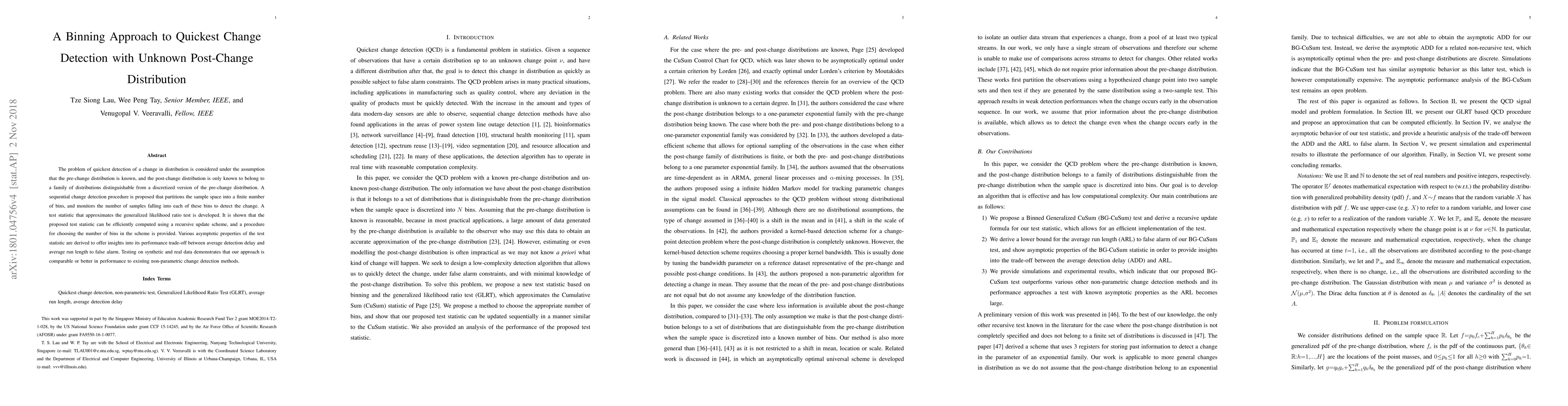 This paper proposes a binning approach for quickest change detection where the post-change distribution is unknown but distinguishable from a discretized pre-change distribution. The method efficiently computes a test statistic using a recursive update scheme and demonstrates comparable or superior performance to existing non-parametric methods.