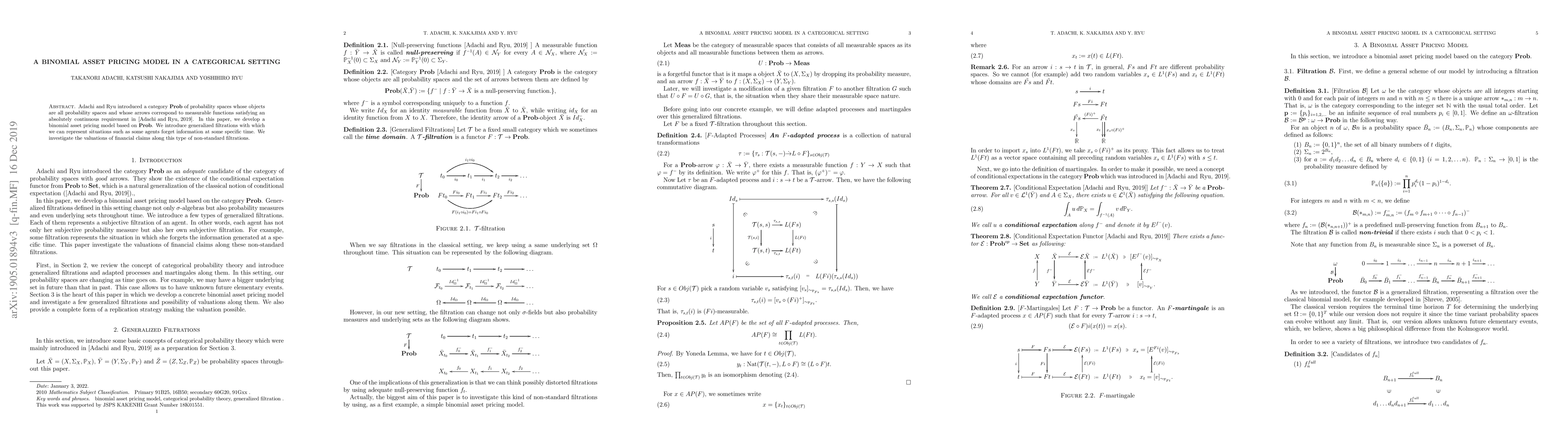 Adachi and Ryu introduced a category Prob of probability spaces whose objects are all probability spaces and whose arrows correspond to measurable functions satisfying an absolutely continuous requirement in [Adachi and Ryu, 2019]. In this paper, we develop a binomial asset pricing model based on Prob. We introduce generalized filtrations with which we can represent situations such as some agents forget information at some specific time. We investigate the valuations of financial claims along this type of non-standard filtrations.