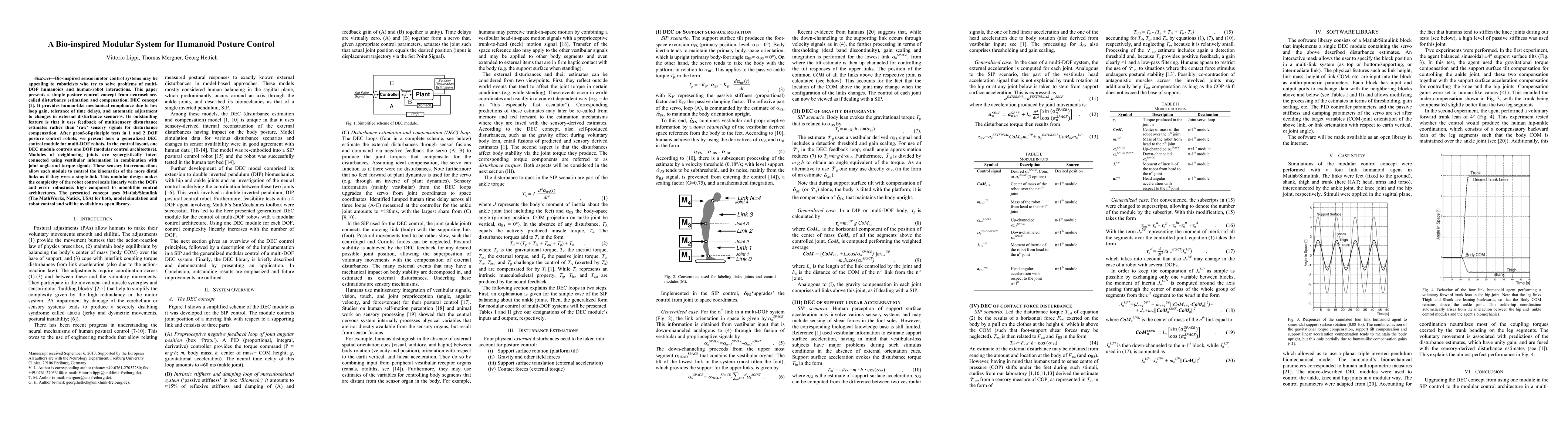 This paper proposes a bio-inspired DEC control module for humanoid posture control, employing multisensory disturbance estimates rather than raw signals for adaptive compensation, leading to scalable and robust multi-DOF robot control. The modular architecture interconnects neighboring joint modules using vestibular and joint data to simplify complex control tasks.