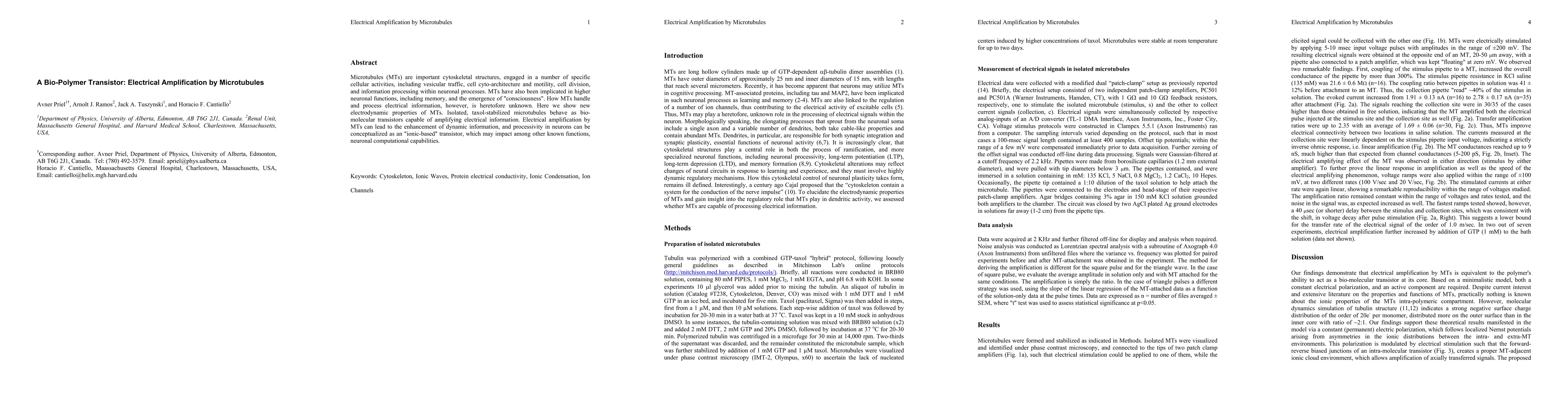 Microtubules (MTs) are important cytoskeletal structures, engaged in a number of specific cellular activities, including vesicular traffic, cell cyto-architecture and motility, cell division, and information processing within neuronal processes. MTs have also been implicated in higher neuronal functions, including memory, and the emergence of "consciousness". How MTs handle and process electrical information, however, is heretofore unknown. Here we show new electrodynamic properties of MTs. Isolated, taxol-stabilized microtubules behave as bio-molecular transistors capable of amplifying electrical information. Electrical amplification by MTs can lead to the enhancement of dynamic information, and processivity in neurons can be conceptualized as an "ionic-based" transistor, which may impact among other known functions, neuronal computational capabilities.