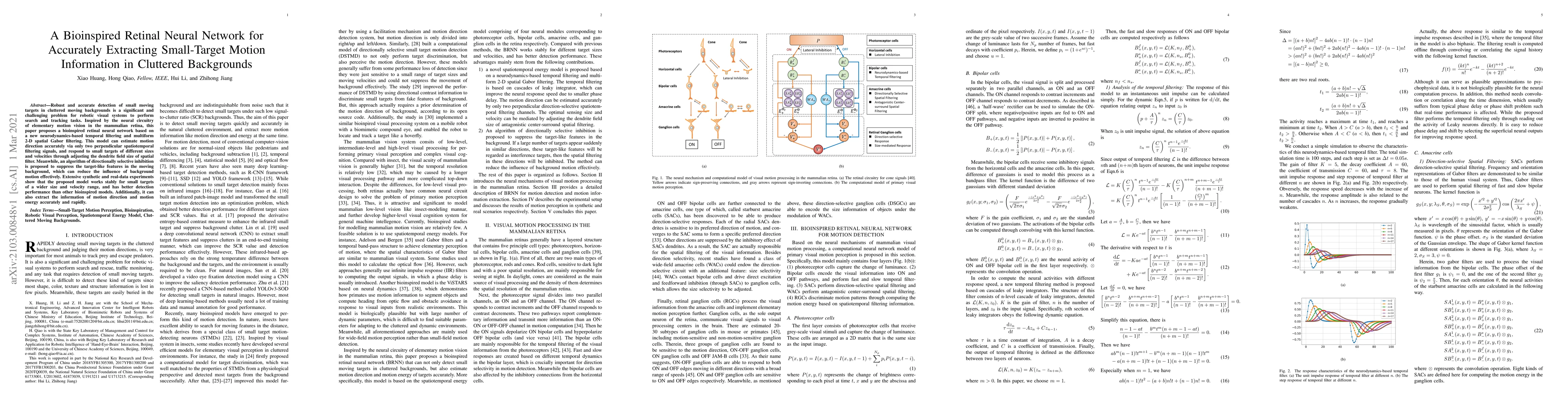 Robust and accurate detection of small moving targets in cluttered moving backgrounds is a significant and challenging problem for robotic visual systems to perform search and tracking tasks. Inspired by the neural circuitry of elementary motion vision in the mammalian retina, this paper proposes a bioinspired retinal neural network based on a new neurodynamics-based temporal filtering and multiform 2-D spatial Gabor filtering. This model can estimate motion direction accurately via only two perpendicular spatiotemporal filtering signals, and respond to small targets of different sizes and velocities by adjusting the dendrite field size of the spatial filter. Meanwhile, an algorithm of directionally selective inhibition is proposed to suppress the target-like features in the moving background, which can reduce the influence of background motion effectively. Extensive synthetic and real-data experiments show that the proposed model works stably for small targets of a wider size and velocity range, and has better detection performance than other bioinspired models. Additionally, it can also extract the information of motion direction and motion energy accurately and rapidly.