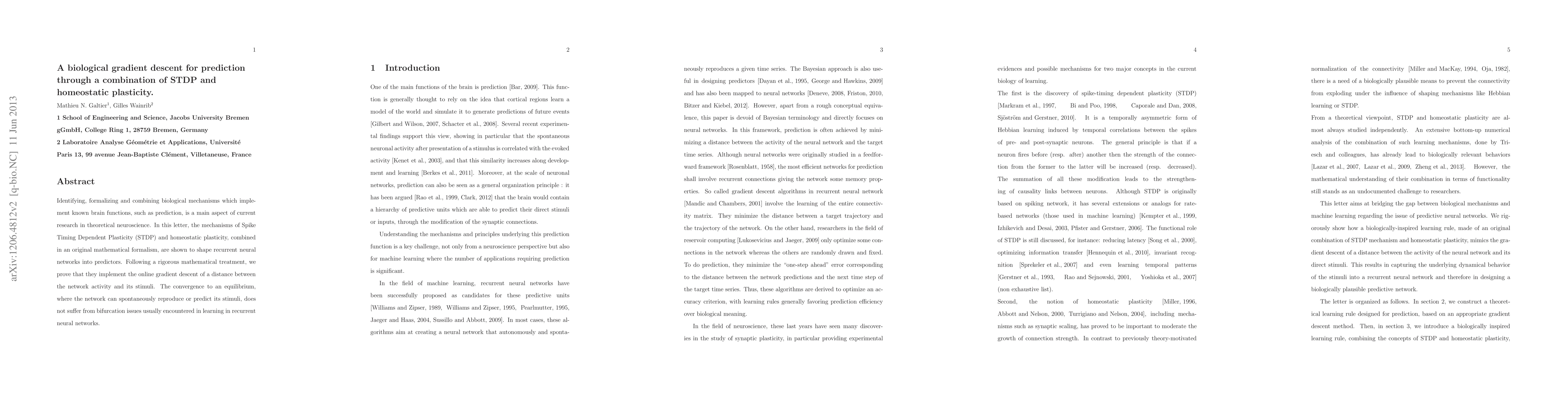 This paper combines Spike Timing Dependent Plasticity (STDP) and homeostatic plasticity in a novel mathematical framework to develop recurrent neural networks that predict stimuli. The approach ensures stable convergence without typical bifurcation issues, leveraging biological gradient descent.