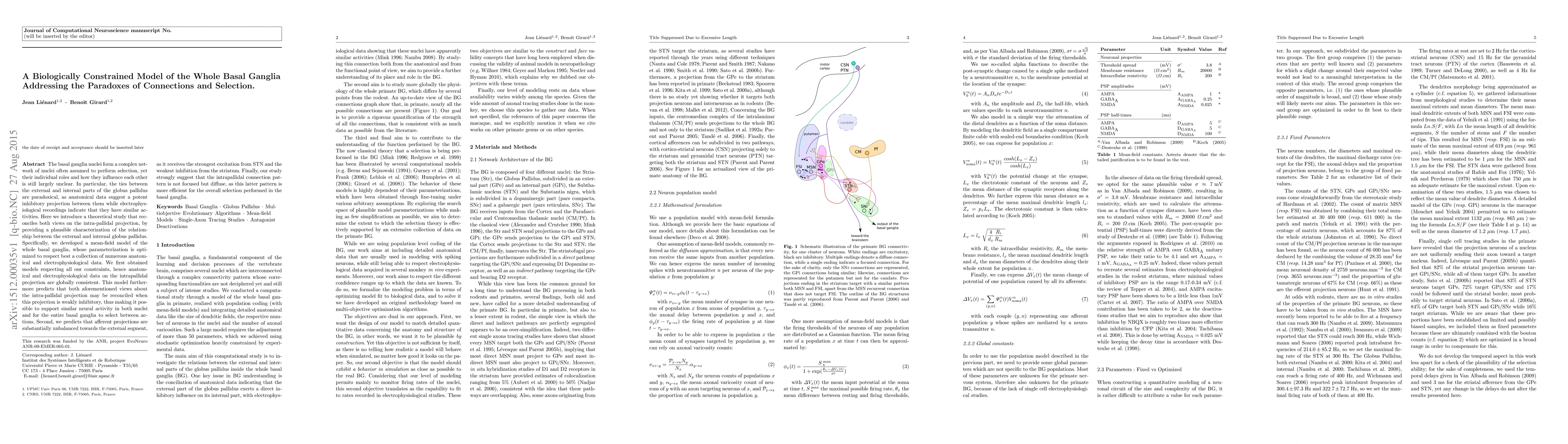 This paper presents a biologically constrained mean-field model of the basal ganglia that reconciles anatomical and electrophysiological data on the paradoxical connections between the external and internal globus pallidus. The model suggests that a weakly inhibitory intrapallidal projection can support similar neural activity in both nuclei, allowing for action selection.
