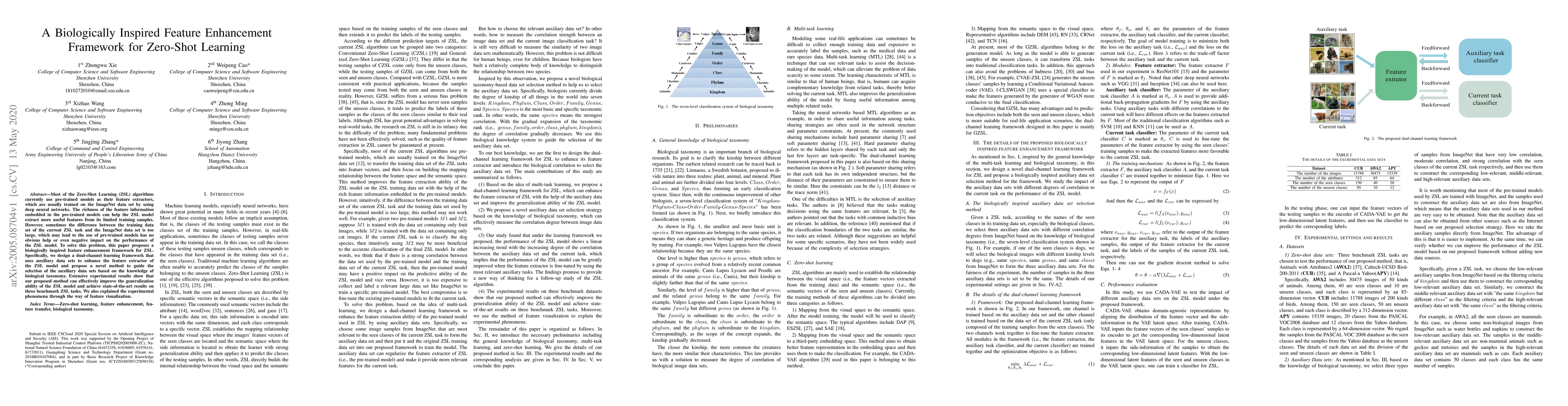 Most of the Zero-Shot Learning (ZSL) algorithms currently use pre-trained models as their feature extractors, which are usually trained on the ImageNet data set by using deep neural networks. The richness of the feature information embedded in the pre-trained models can help the ZSL model extract more useful features from its limited training samples. However, sometimes the difference between the training data set of the current ZSL task and the ImageNet data set is too large, which may lead to the use of pre-trained models has no obvious help or even negative impact on the performance of the ZSL model. To solve this problem, this paper proposes a biologically inspired feature enhancement framework for ZSL. Specifically, we design a dual-channel learning framework that uses auxiliary data sets to enhance the feature extractor of the ZSL model and propose a novel method to guide the selection of the auxiliary data sets based on the knowledge of biological taxonomy. Extensive experimental results show that our proposed method can effectively improve the generalization ability of the ZSL model and achieve state-of-the-art results on three benchmark ZSL tasks. We also explained the experimental phenomena through the way of feature visualization.