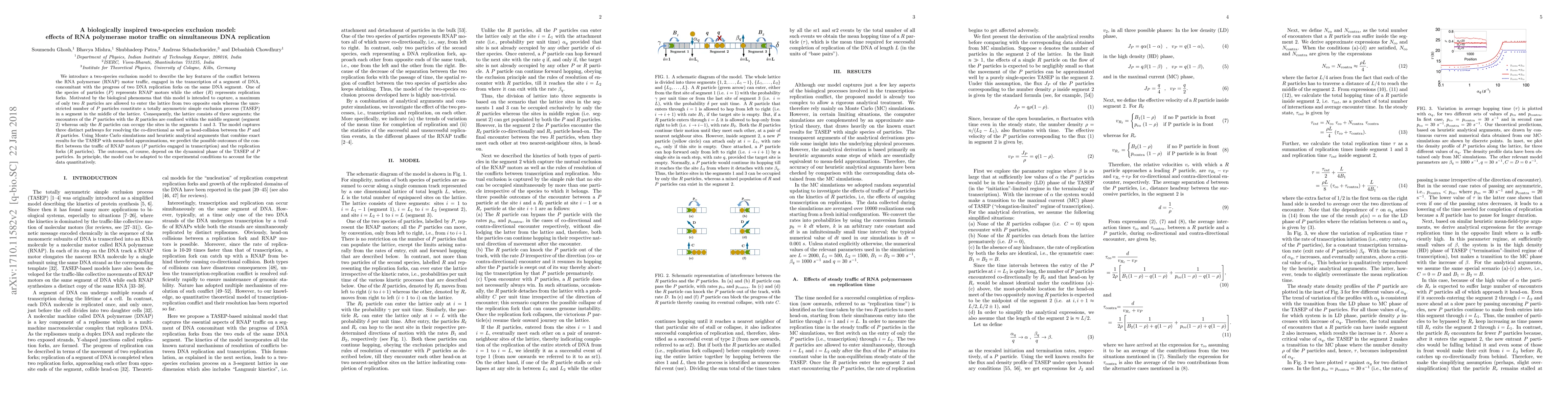 This paper introduces a two-species exclusion model to study the conflict between RNA polymerase motors during transcription and DNA replication forks on the same DNA segment. The model predicts outcomes based on Monte Carlo simulations and analytical approximations, capturing distinct pathways for resolving particle encounters.