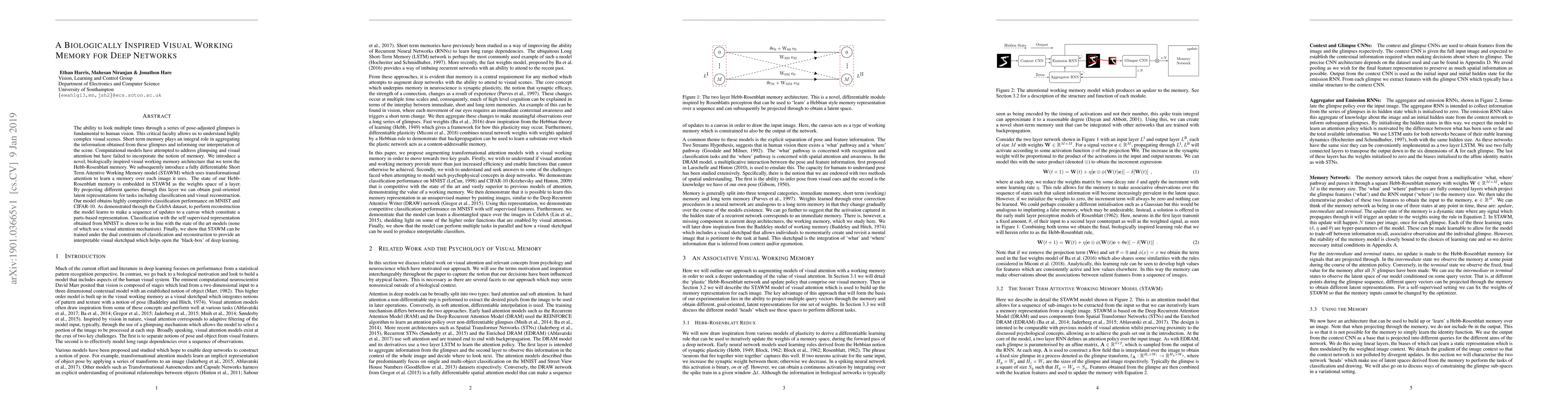 This paper introduces a biologically inspired visual working memory model called Hebb-Rosenblatt memory, embedded within a Short Term Attentive Working Memory (STAWM) model to enhance deep networks. The STAWM model uses transformational attention to learn memory over images, achieving competitive classification and reconstruction performance on MNIST, CIFAR-10, and CelebA datasets.
