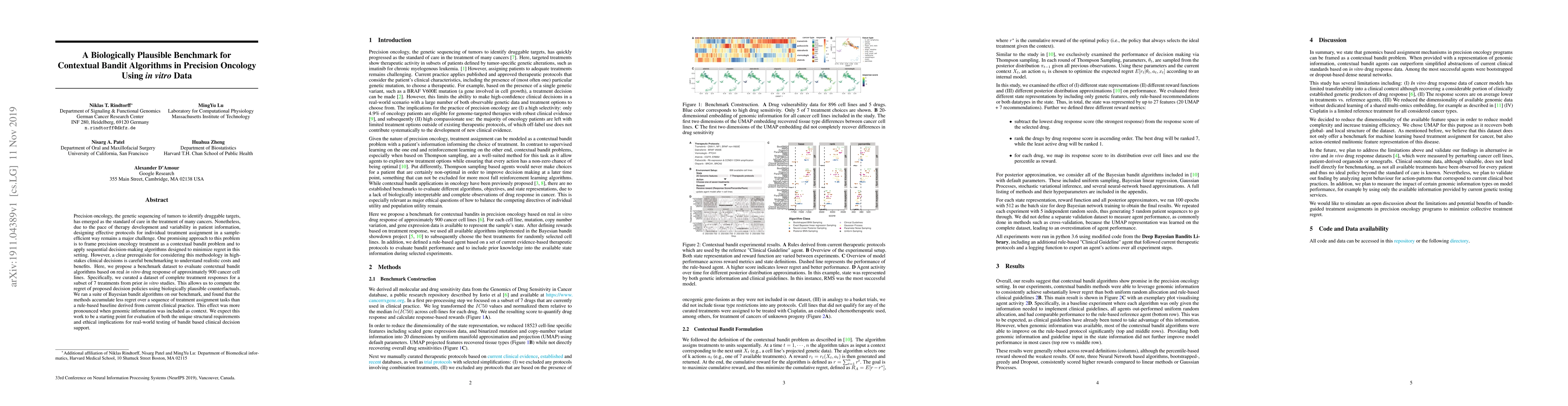 This paper proposes a benchmark dataset based on in vitro drug response data to evaluate contextual bandit algorithms for precision oncology. The study finds that Bayesian bandit algorithms outperform a rule-based clinical practice baseline, especially when genomic information is included, suggesting potential for improved treatment assignment in oncology.