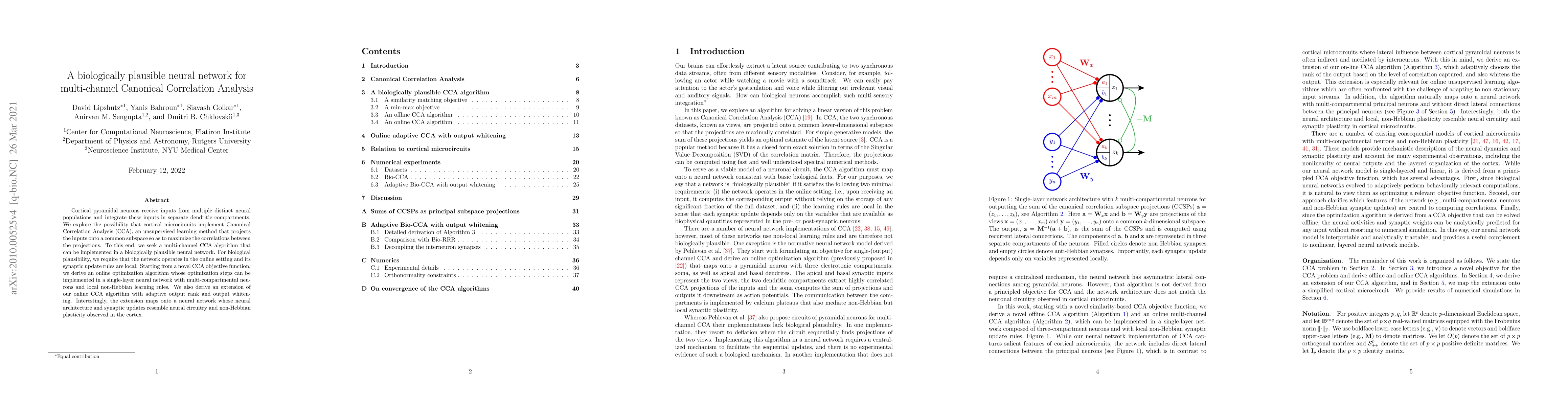 This paper proposes a biologically plausible neural network implementing multi-channel Canonical Correlation Analysis (CCA) using local synaptic updates and online learning. The derived algorithm maps onto cortical pyramidal neurons, aligning with observed neural circuitry and plasticity.