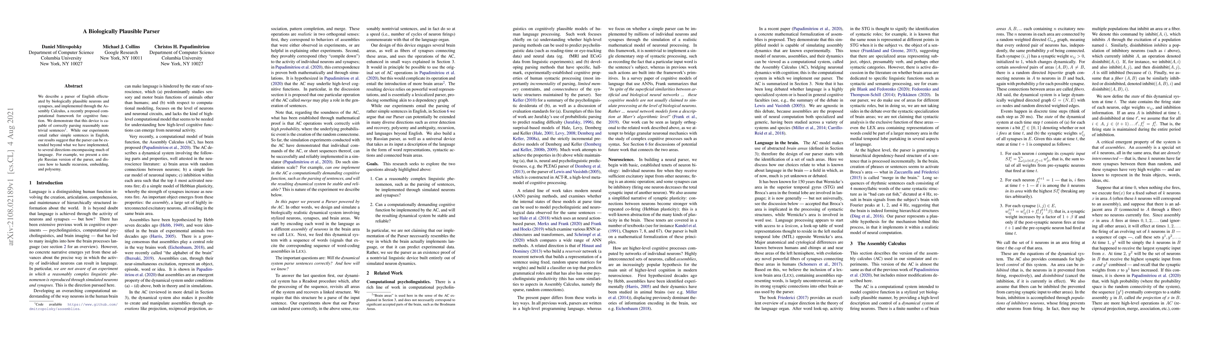 This paper presents a biologically plausible parser for English implemented using the Assembly Calculus, demonstrating its ability to parse nontrivial sentences. The authors suggest the parser's potential for broader language capabilities, including handling recursion, embedding, and polysemy, as evidenced by a simple Russian version.