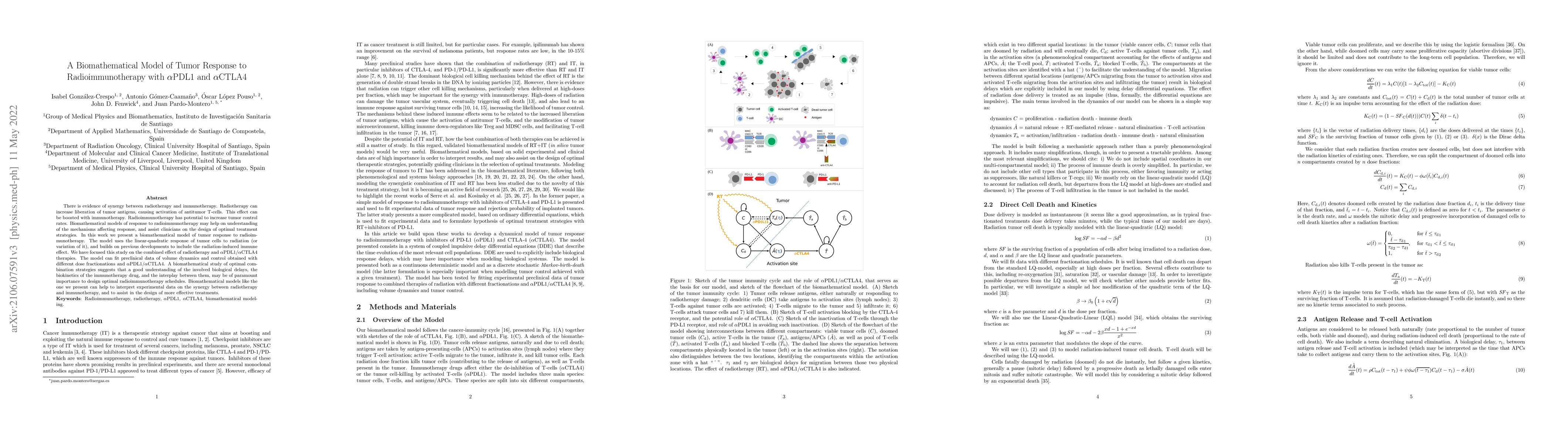 This paper presents a biomathematical model to study tumor response to radioimmunotherapy combining $\alpha$PDL1 and $\alpha$CTLA4. The model integrates the linear-quadratic response of tumor cells to radiation and the radiation-induced immune effect, aiming to optimize treatment strategies for better tumor control.