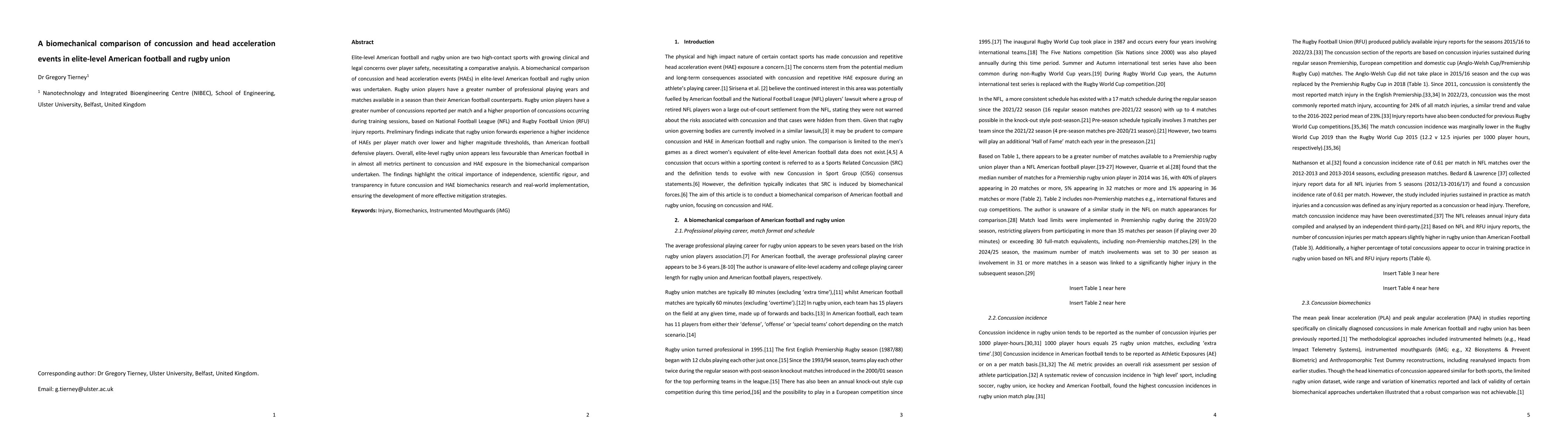A biomechanical comparison of concussion and head acceleration events (HAEs) was conducted in elite-level American football and rugby union using injury reports from the National Football League (NFL) and Rugby Football Union (RFU).