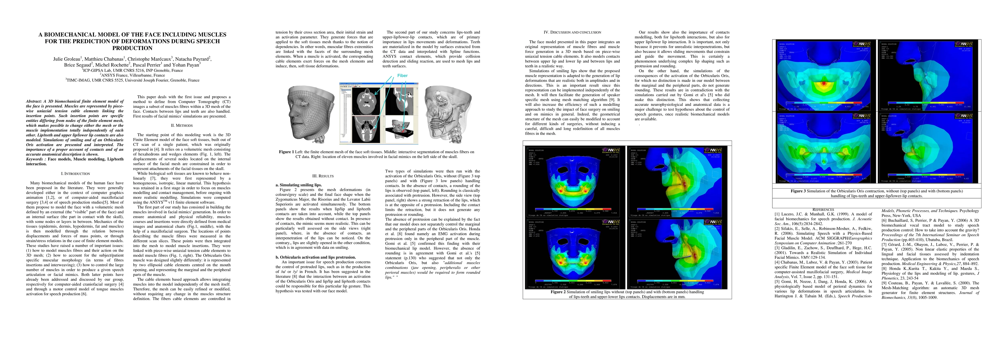 A 3D biomechanical finite element model of the face is presented. Muscles are represented by piece-wise uniaxial tension cable elements linking the insertion points. Such insertion points are specific entities differing from nodes of the finite element mesh, which makes possible to change either the mesh or the muscle implementation totally independently of each other. Lip/teeth and upper lip/lower lip contacts are also modeled. Simulations of smiling and of an Orbicularis Oris activation are presented and interpreted. The importance of a proper account of contacts and of an accurate anatomical description is shown