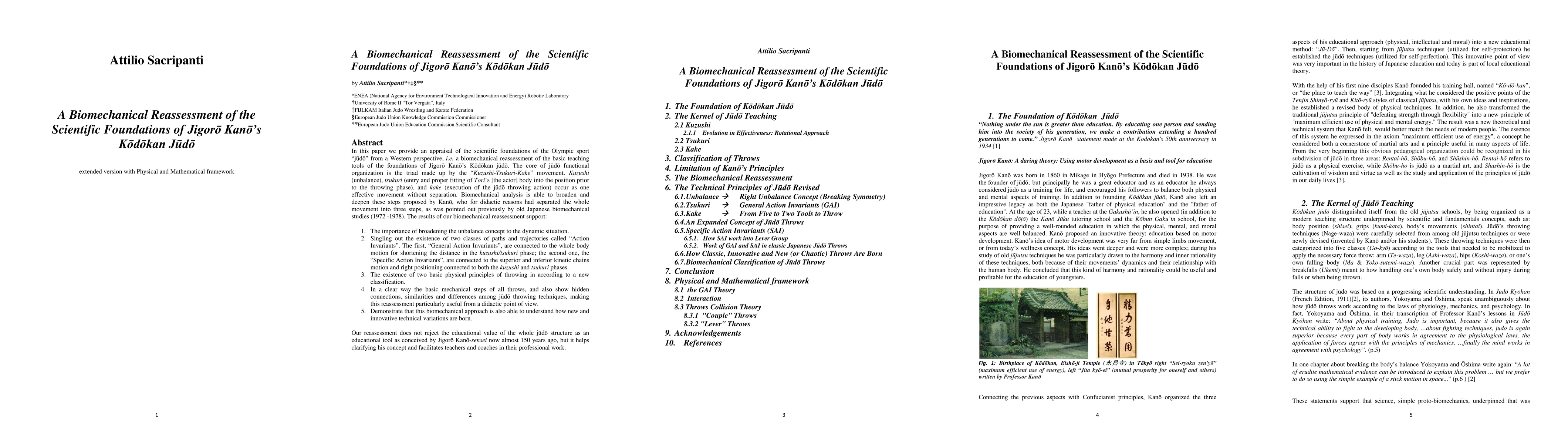 In this paper we provide an appraisal of the scientific foundations of the Olympic sport "judo" from a Western perspective, i.e. a biomechanical reassessment of the basic teaching tools of the foundations of Jigoro Kano's Kodokan judo. The core of judo functional organization is the triad made up by the "Kuzushi-Tsukuri-Kake" movement. Kuzushi (unbalance), tsukuri (entry and proper fitting of Tori's [the actor] body into the position prior to the throwing phase), and kake (execution of the judo throwing action) occur as one effective movement without separation. Biomechanical analysis is able to broaden and deepen these steps proposed by Kan\=o, who for didactic reasons had separated the whole movement into three steps, as was pointed out previously by old Japanese biomechanical studies. The results of our biomechanical reassessment support: The importance of broadening the unbalance concept to the dynamic situation.Singling out the existence of two classes of paths and trajectories called "Action Invariants". The first, "General Action Invariants", are connected to the whole body motion for shortening the distance in the kuzushi/tsukuri phase; the second one, the "Specific Action Invariants", are connected to the superior and inferior kinetic chains motion and right positioning connected to both the kuzushi and tsukuri phases.The existence of two basic physical principles of throwing in according to a new classification.In a clear way the basic mechanical steps of all throws, and also show hidden connections, similarities and differences among judo throwing techniques, making this reassessment particularly useful from a didactic point of view. Demonstrate that this biomechanical approach is also able to understand how new and innovative technical variations are born.Our reassessment helps clarifying his concept and facilitates teachers and coaches in their professional work.