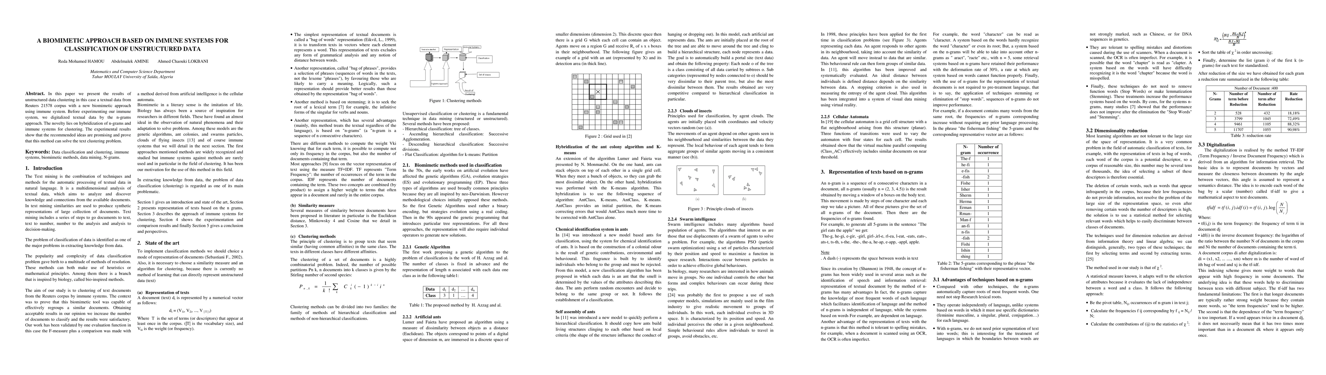 In this paper we present the results of unstructured data clustering in this case a textual data from Reuters 21578 corpus with a new biomimetic approach using immune system. Before experimenting our immune system, we digitalized textual data by the n-grams approach. The novelty lies on hybridization of n-grams and immune systems for clustering. The experimental results show that the recommended ideas are promising and prove that this method can solve the text clustering problem.