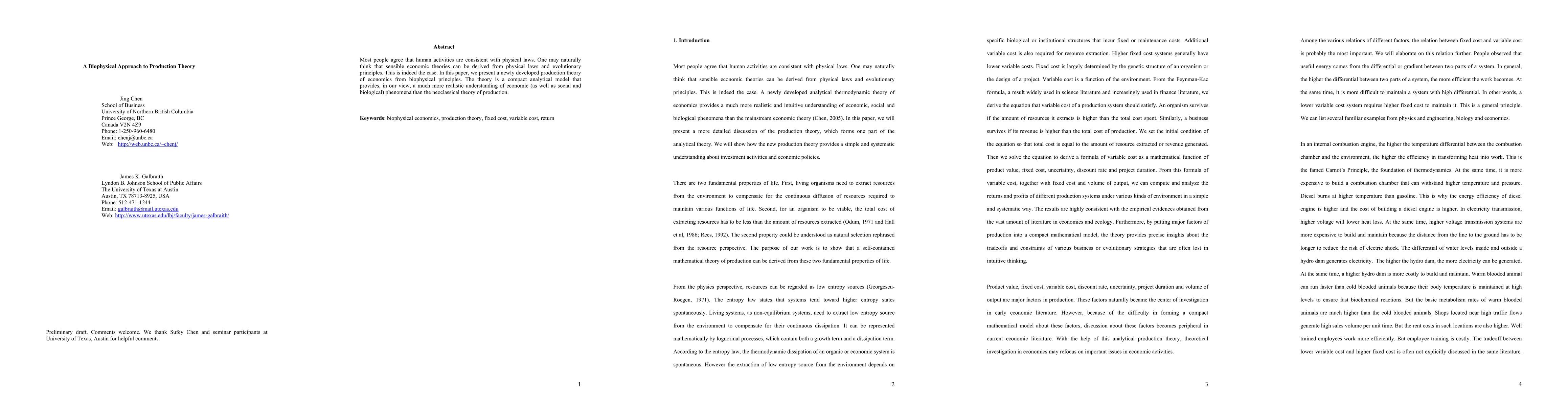 This paper proposes a new economic production theory grounded in biophysical principles, presenting a more realistic model than neoclassical theory, based on physical laws and evolutionary principles.
