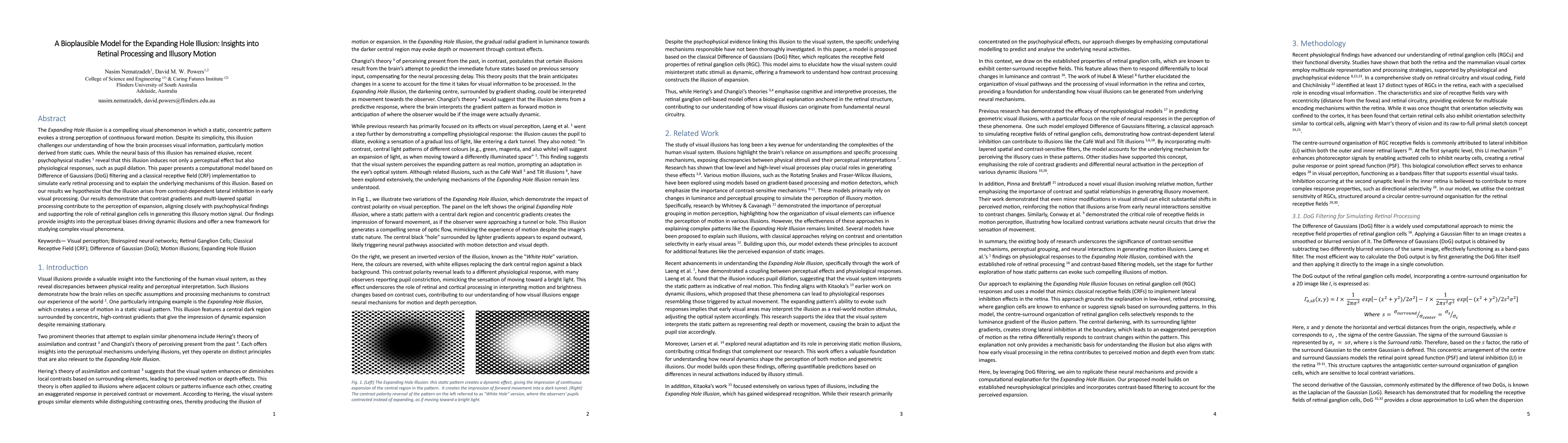 This paper introduces a computational model simulating the Expanding Hole Illusion using Difference of Gaussians and classical receptive fields to explain how static patterns evoke illusory motion, attributing the phenomenon to contrast-dependent lateral inhibition in early visual processing and highlighting the role of retinal ganglion cells.