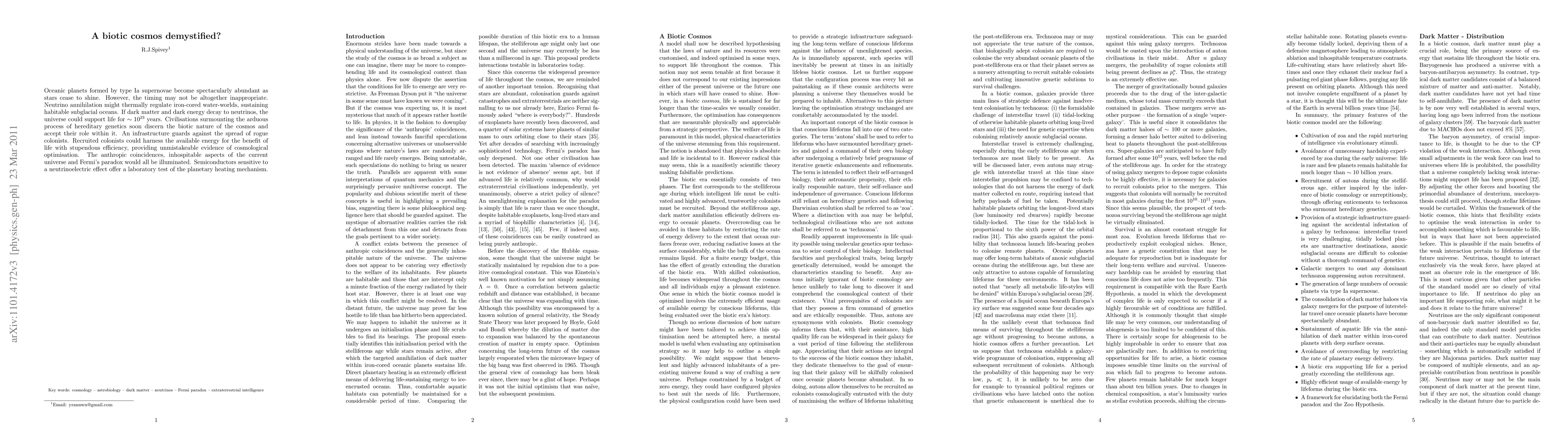 Oceanic planets formed by type Ia supernovae become spectacularly abundant as stars cease to shine. However, the timing may not be altogether inappropriate. Neutrino annihilation might thermally regulate iron-cored water-worlds, sustaining habitable subglacial oceans. If dark matter and dark energy decay to neutrinos, the universe could support life for ~ 10^23 years. Civilisations surmounting the arduous process of hereditary genetics soon discern the biotic nature of the cosmos and accept their role within it. An infrastructure guards against the spread of rogue colonists. Recruited colonists could harness the available energy for the benefit of life with stupendous efficiency, providing unmistakeable evidence of cosmological optimisation. The anthropic coincidences, inhospitable aspects of the current universe and Fermi's paradox would all be illuminated. Semiconductors sensitive to a neutrinoelectric effect offer a laboratory test of the planetary heating mechanism.