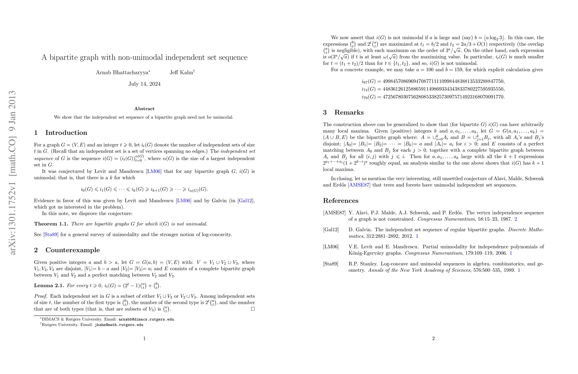 We show that the independent set sequence of a bipartite graph need not be unimodal.