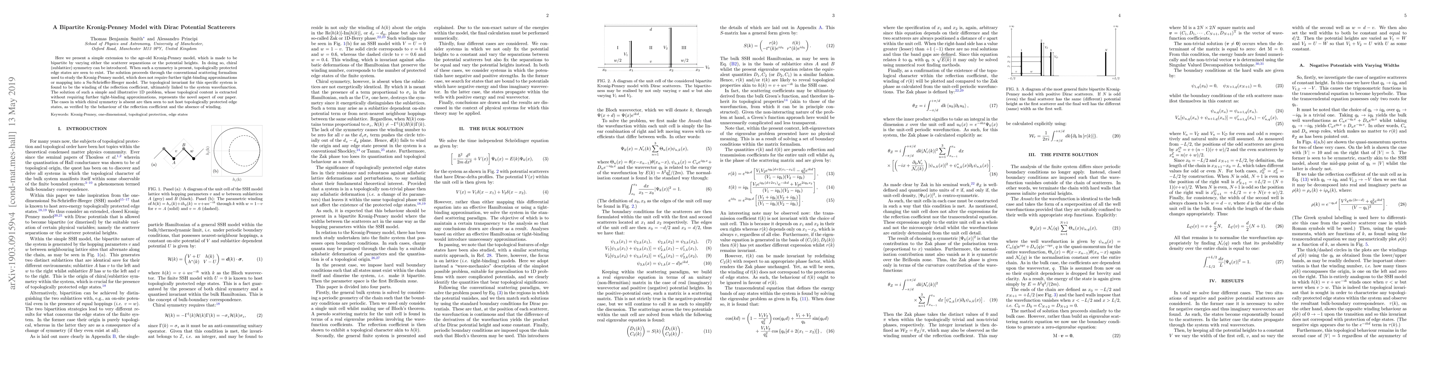 This paper extends the Kronig-Penney model to a bipartite structure with Dirac potential scatterers, introducing chiral symmetry and topologically protected edge states. The topological invariant is identified through the winding of the reflection coefficient, demonstrating the system's unique topological properties without additional approximations.