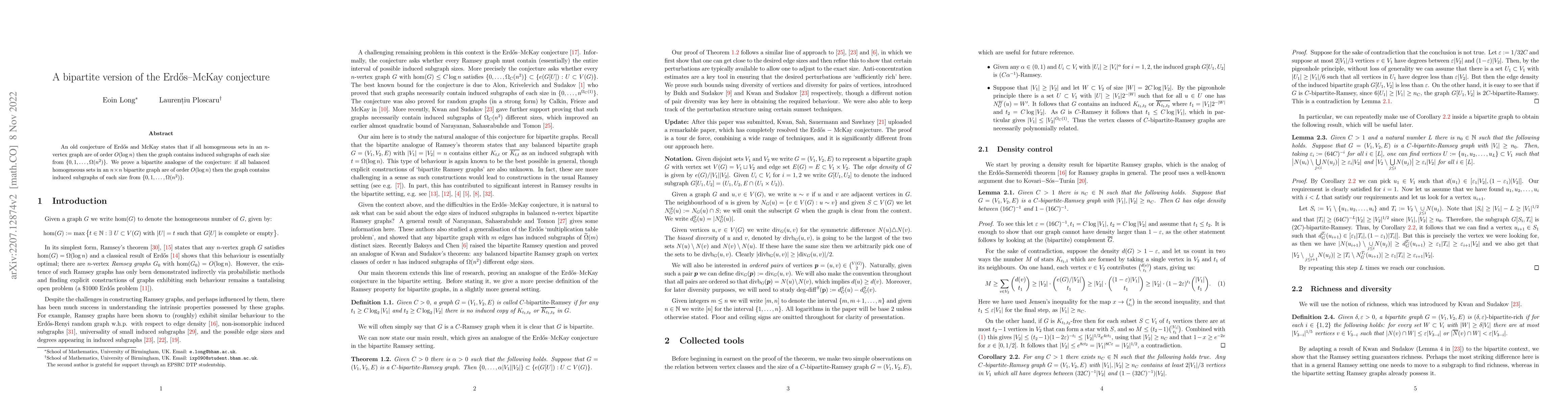The paper proves a bipartite analogue of the Erdős-McKay conjecture, showing that if all balanced homogeneous sets in an $n \times n$ bipartite graph are of order $O(\log n)$, then the graph contains induced subgraphs of each size from $\{0,1,\ldots, \Omega (n^2)\}$.