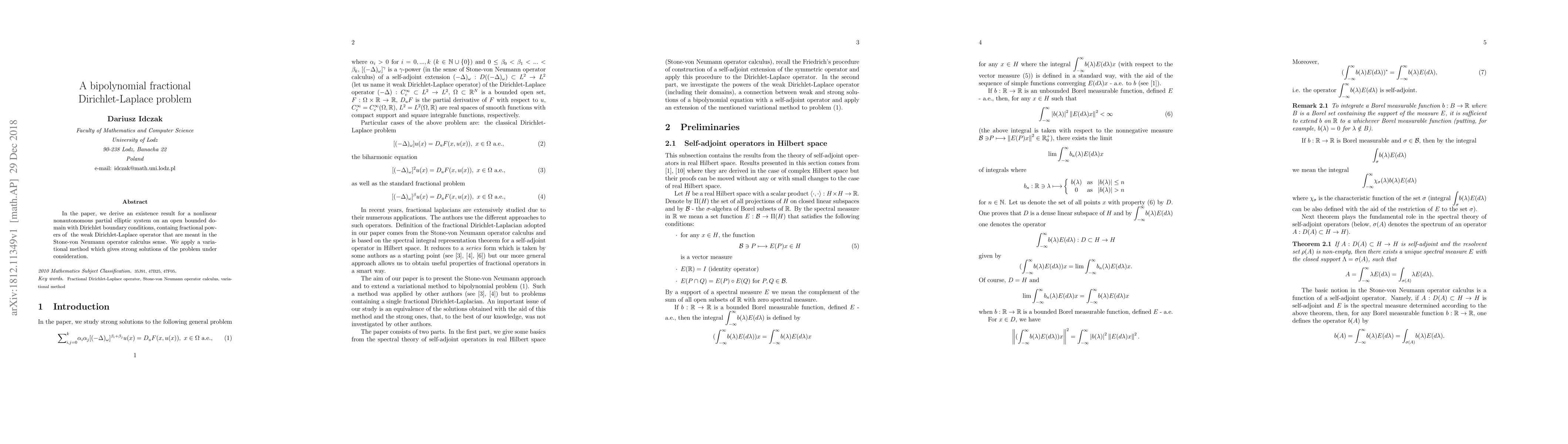 In the paper, we derive an existence result for a nonlinear nonautonomous partial elliptic system on an open bounded domain with Dirichlet boundary conditions, containg fractional powers of the weak Dirichlet-Laplace operator that are meant in the Stone-von Neumann operator calculus sense. We apply a variational method which gives strong solutions of the problem under consideration.