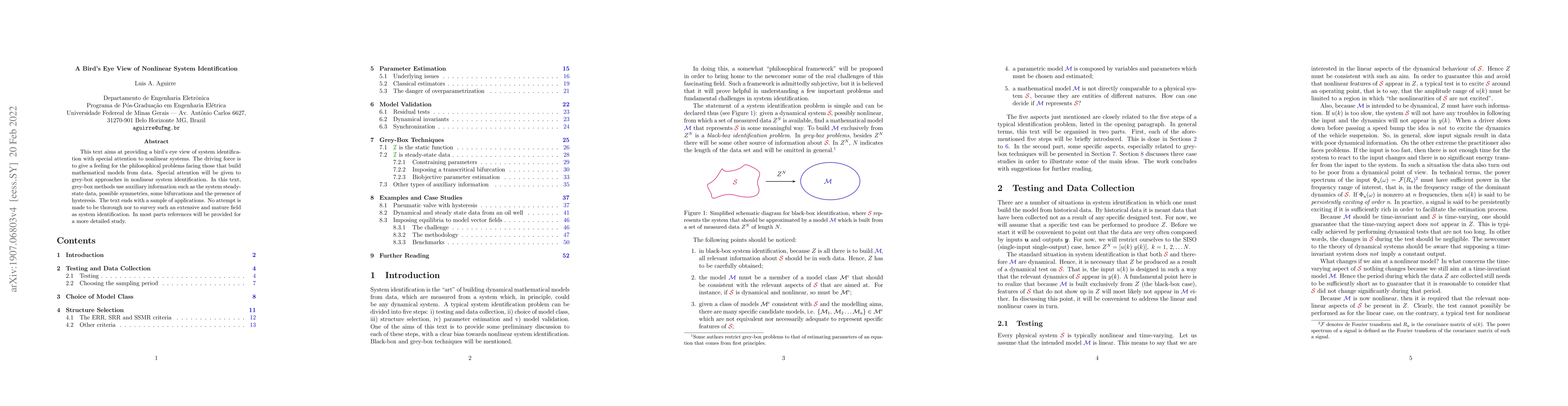 This text aims at providing a bird's eye view of system identification with special attention to nonlinear systems. The driving force is to give a feeling for the philosophical problems facing those that build mathematical models from data. Special attention will be given to grey-box approaches in nonlinear system identification. In this text, grey-box methods use auxiliary information such as the system steady-state data, possible symmetries, some bifurcations and the presence of hysteresis. The text ends with a sample of applications. No attempt is made to be thorough nor to survey such an extensive and mature field as system identification. In most parts references will be provided for a more detailed study.