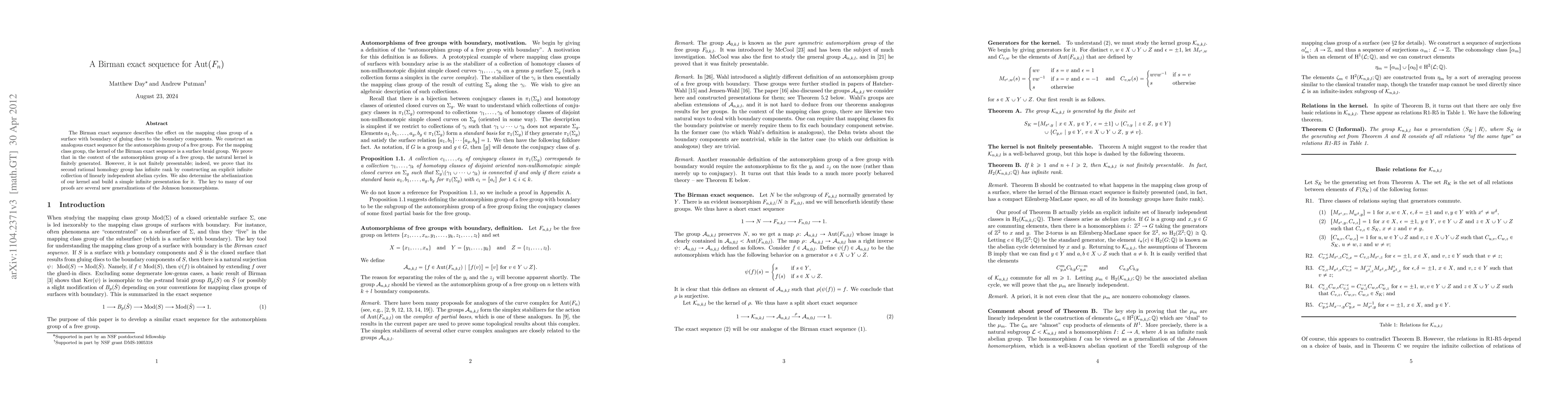 The paper constructs an exact sequence analogous to the Birman exact sequence for the automorphism group of a free group, showing its kernel is finitely generated but not finitely presentable, as its second rational homology group has infinite rank. The authors determine the abelianization of this kernel and provide a simple infinite presentation for it, using new generalizations of the Johnson homomorphisms.