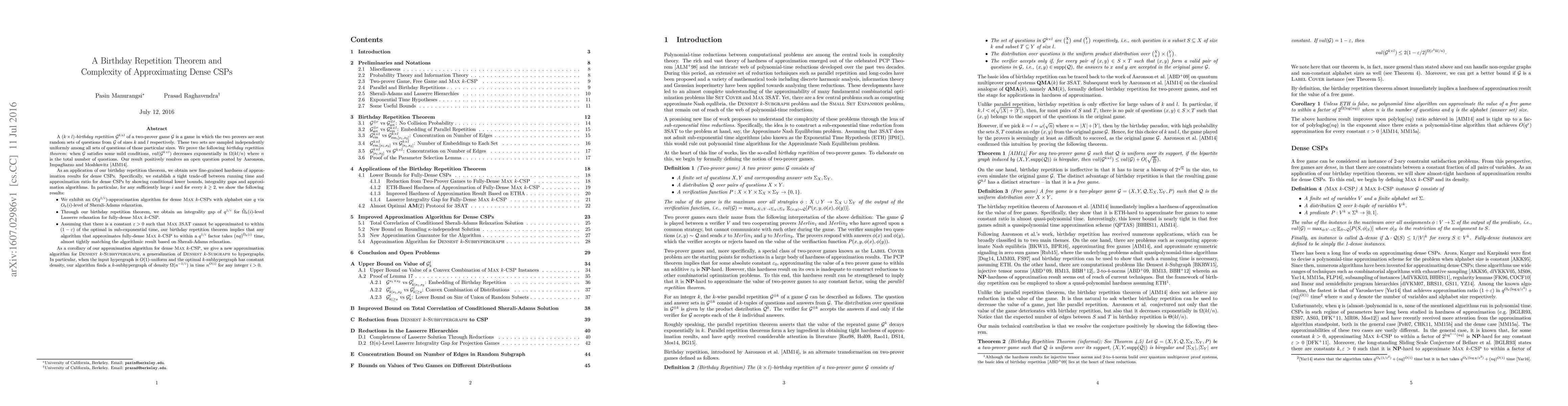 This paper proves a birthday repetition theorem for two-prover games, showing that the value of the game decreases exponentially with the product of the set sizes divided by the total number of questions. The theorem is applied to establish fine-grained hardness results for dense CSPs, including approximation algorithms and integrality gaps, and conditional lower bounds matching algorithmic results.