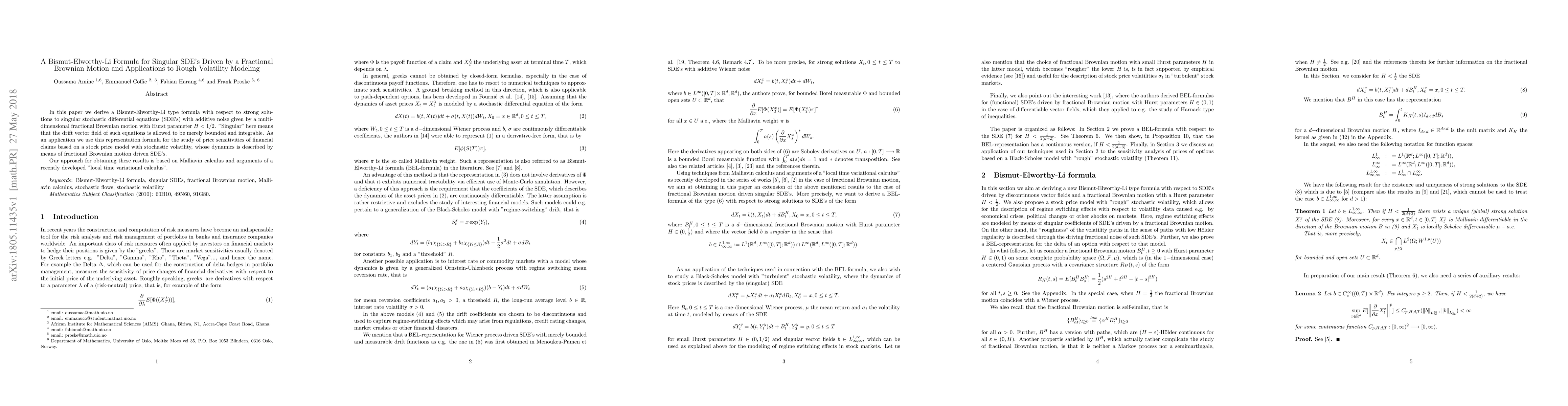 In this paper we derive a Bismut-Elworthy-Li type formula with respect to strong solutions to singular stochastic differential equations (SDE's) with additive noise given by a multi-dimensional fractional Brownian motion with Hurst parameter $H<1/2$. "Singular" here means that the drift vector field of such equations is allowed to be merely bounded and integrable. As an application we use this representation formula for the study of price sensitivities of financial claims based on a stock price model with stochastic volatility, whose dynamics is described by means of fractional Brownian motion driven SDE's. Our approach for obtaining these results is based on Malliavin calculus and arguments of a recently developed "local time variational calculus".