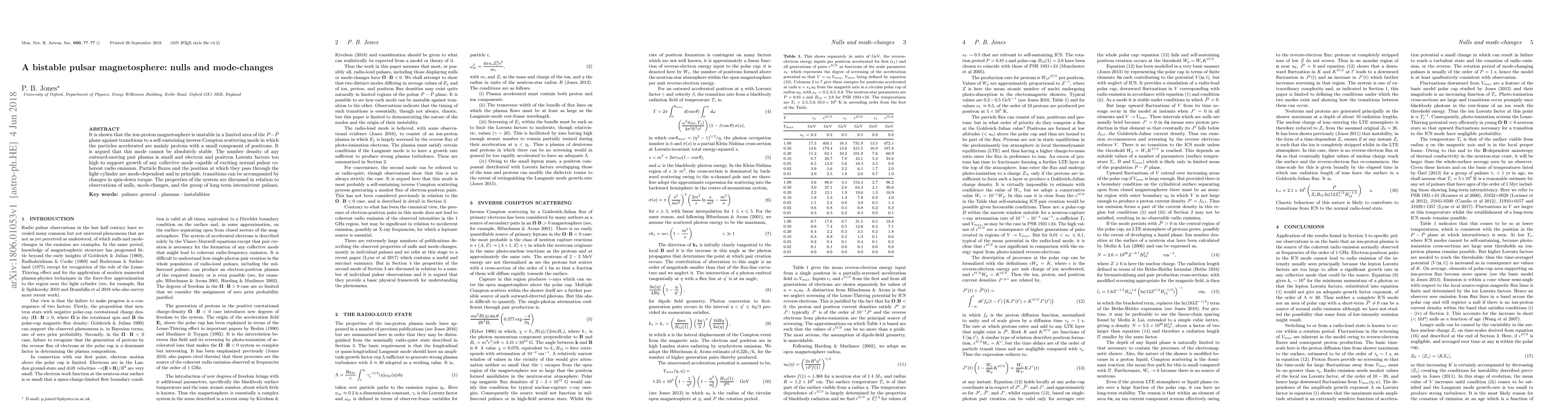 It is shown that the ion-proton magnetosphere is unstable in a limited area of the P - Pdot plane against transitions to a self-sustaining inverse Compton scattering mode in which the particles accelerated are mainly protons with a small component of positrons. It is argued that this mode cannot be absolutely stable. The number density of any outward-moving pair plasma is small and electron and positron Lorentz factors too high to support growth of any collective mode capable of exciting normal pulsar coherent radio emission. Particle fluxes and the position at which they pass through the light cylinder are mode-dependent and in principle, transitions can be accompanied by changes in spin-down torque. The properties of the system are discussed in relation to observations of nulls, mode-changes, and the group of long-term intermittent pulsars.