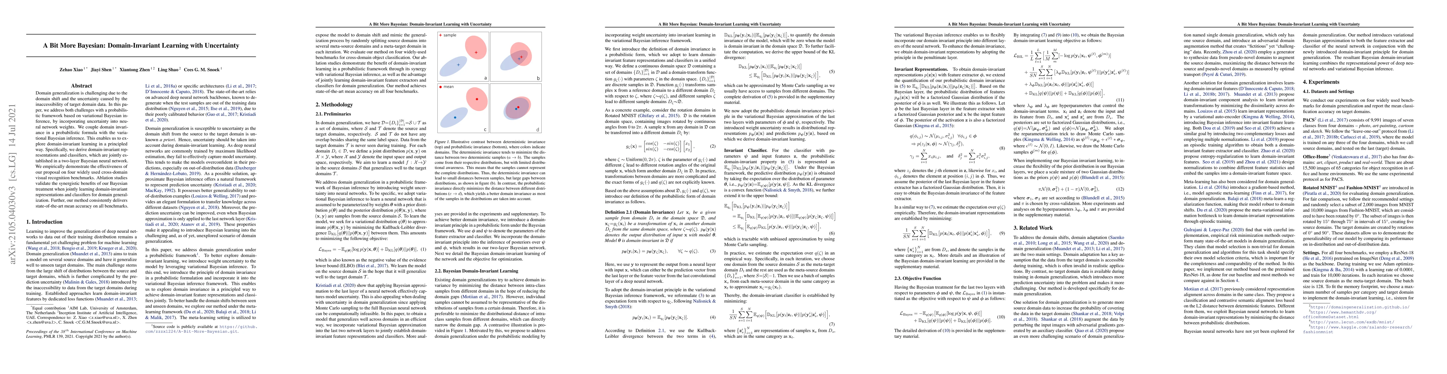 This paper proposes a probabilistic framework using variational Bayesian inference to tackle domain generalization challenges by incorporating uncertainty into neural network weights. The method derives domain-invariant representations and classifiers in a two-layer Bayesian neural network, achieving state-of-the-art performance on four visual recognition benchmarks.
