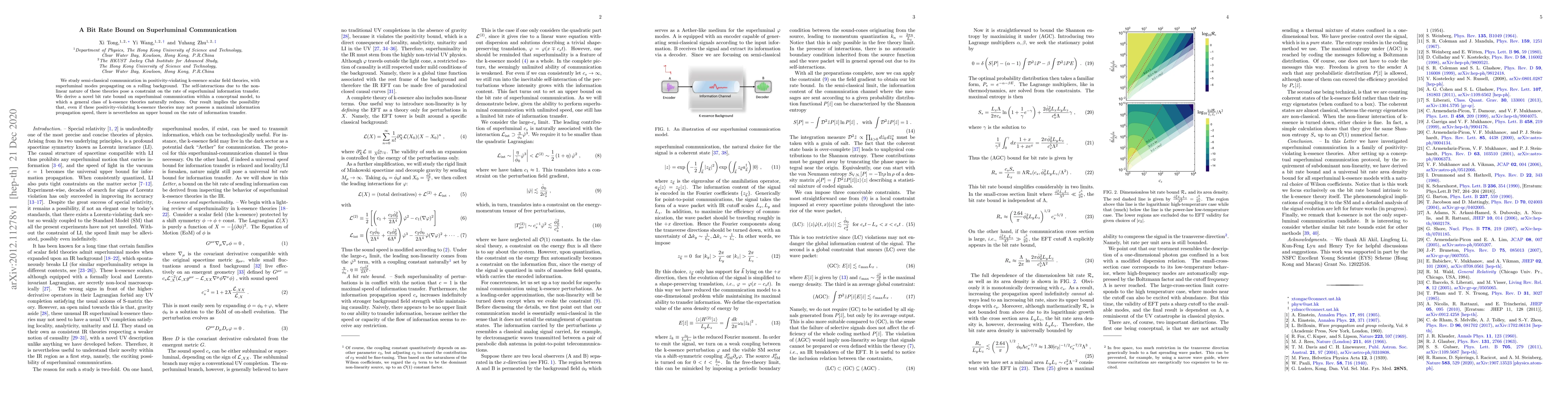 This paper derives a novel bit rate bound on superluminal communication in k-essence scalar field theories, showing that despite the potential for superluminal propagation, there is an upper limit on the rate of information transfer. This constraint arises from the self-interactions inherent in the non-linear nature of these theories.