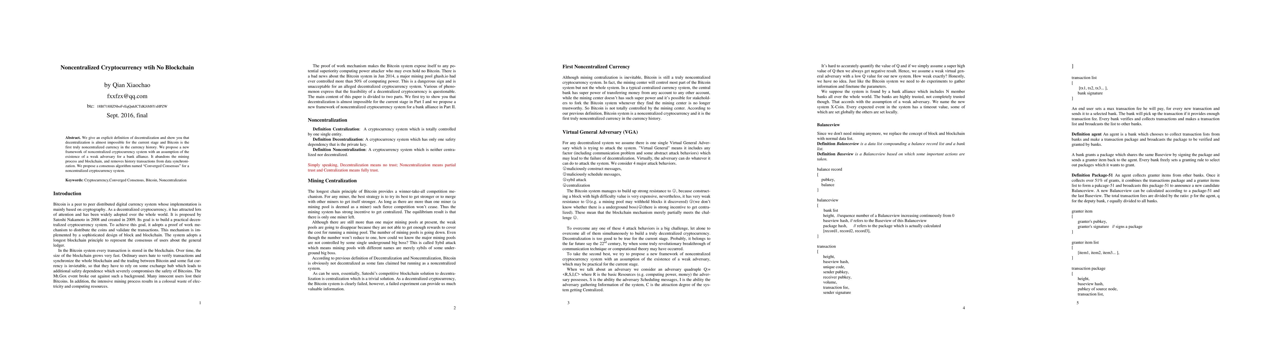 We give an explicit definition of decentralization and show you that decentralization is almost impossible for the current stage and Bitcoin is the first truly noncentralized currency in the currency history. We propose a new framework of noncentralized cryptocurrency system with an assumption of the existence of a weak adversary for a bank alliance. It abandons the mining process and blockchain, and removes history transactions from data synchronization. We propose a consensus algorithm named Converged Consensus for a noncentralized cryptocurrency system.