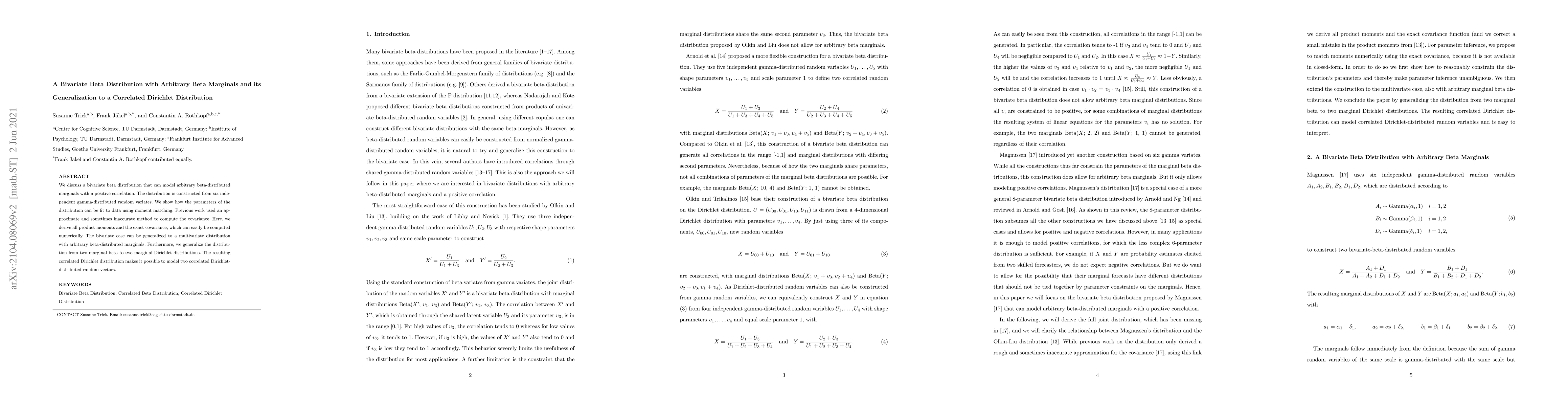 We discuss a bivariate beta distribution that can model arbitrary beta-distributed marginals with a positive correlation. The distribution is constructed from six independent gamma-distributed random variates. We show how the parameters of the distribution can be fit to data using moment matching. Previous work used an approximate and sometimes inaccurate method to compute the covariance. Here, we derive all product moments and the exact covariance, which can easily be computed numerically. The bivariate case can be generalized to a multivariate distribution with arbitrary beta-distributed marginals. Furthermore, we generalize the distribution from two marginal beta to two marginal Dirichlet distributions. The resulting correlated Dirichlet distribution makes it possible to model two correlated Dirichlet-distributed random vectors.