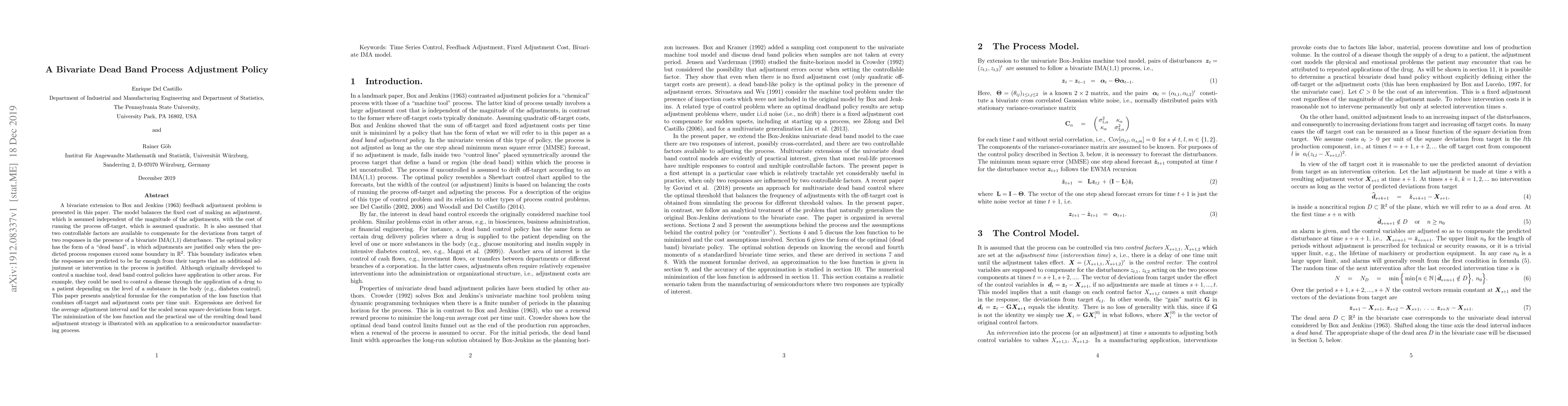 A bivariate extension to Box and Jenkins (1963) feedback adjustment problem is presented in this paper. The model balances the fixed cost of making an adjustment, which is assumed independent of the magnitude of the adjustments, with the cost of running the process off-target, which is assumed quadratic. It is also assumed that two controllable factors are available to compensate for the deviations from target of two responses in the presence of a bivariate IMA(1,1) disturbance. The optimal policy has the form of a "dead band", in which adjustments are justified only when the predicted process responses exceed some boundary in $\mathbb{R}^2$. This boundary indicates when the responses are predicted to be far enough from their targets that an additional adjustment or intervention in the process is justified. Although originally developed to control a machine tool, dead band control policies have application in other areas. For example, they could be used to control a disease through the application of a drug to a patient depending on the level of a substance in the body (e.g., diabetes control). This paper presents analytical formulae for the computation of the loss function that combines off-target and adjustment costs per time unit. Expressions are derived for the average adjustment interval and for the scaled mean square deviations from target. The minimization of the loss function and the practical use of the resulting dead band adjustment strategy is illustrated with an application to a semiconductor manufacturing process.