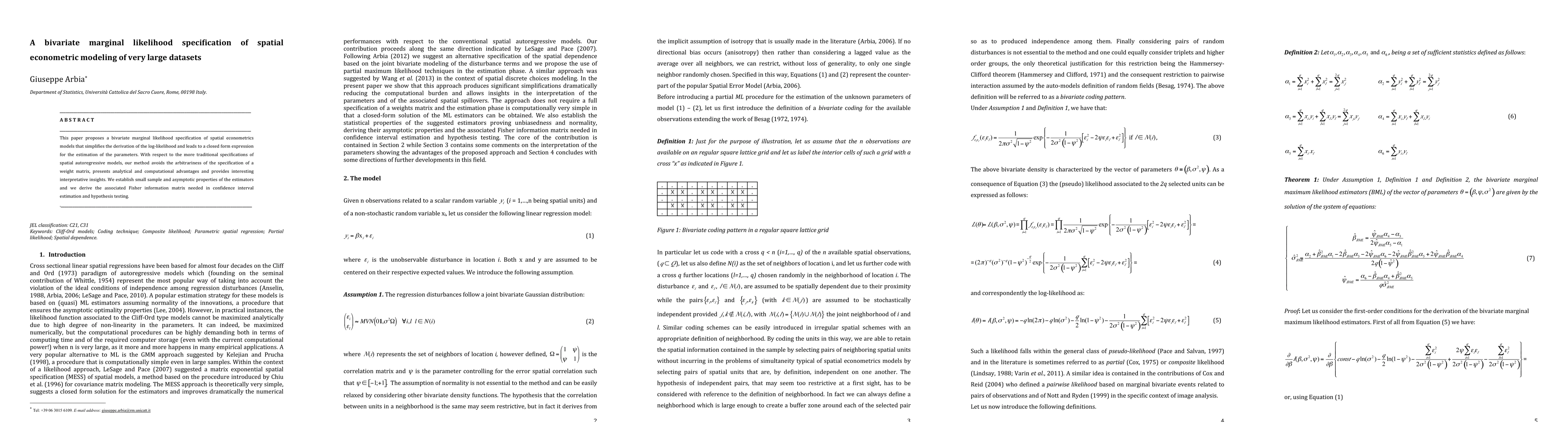 This paper proposes a bivariate marginal likelihood specification of spatial econometrics models that simplifies the derivation of the log-likelihood and leads to a closed form expression for the estimation of the parameters. With respect to the more traditional specifications of spatial autoregressive models, our method avoids the arbitrariness of the specification of a weight matrix, presents analytical and computational advantages and provides interesting interpretative insights. We establish small sample and asymptotic properties of the estimators and we derive the associated Fisher information matrix needed in confidence interval estimation and hypothesis testing.