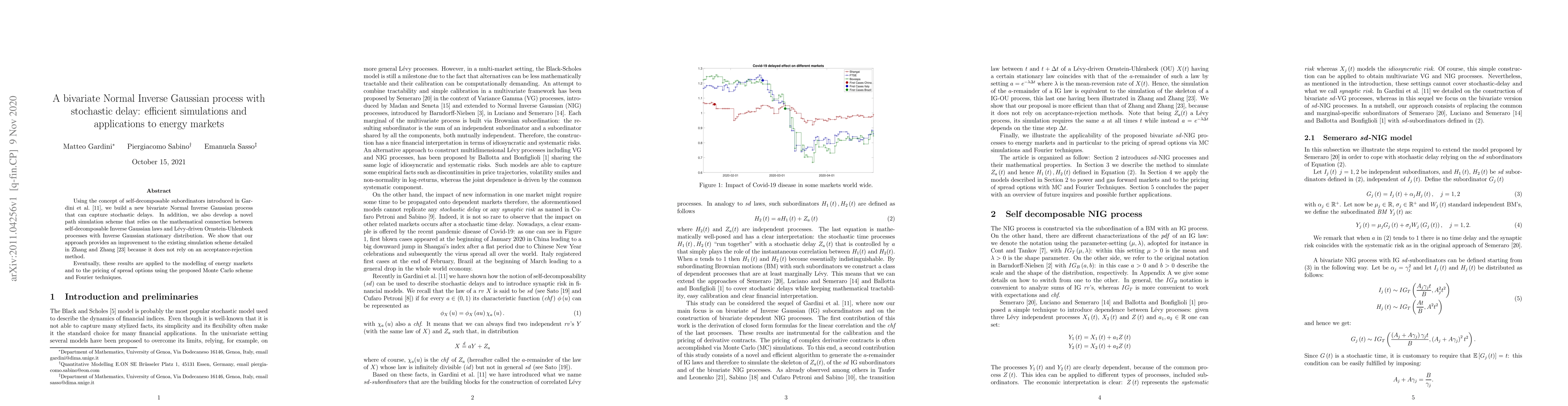 Using the concept of self-decomposable subordinators introduced in Gardini et al. [11], we build a new bivariate Normal Inverse Gaussian process that can capture stochastic delays. In addition, we also develop a novel path simulation scheme that relies on the mathematical connection between self-decomposable Inverse Gaussian laws and L\'evy-driven Ornstein-Uhlenbeck processes with Inverse Gaussian stationary distribution. We show that our approach provides an improvement to the existing simulation scheme detailed in Zhang and Zhang [23] because it does not rely on an acceptance-rejection method. Eventually, these results are applied to the modelling of energy markets and to the pricing of spread options using the proposed Monte Carlo scheme and Fourier techniques