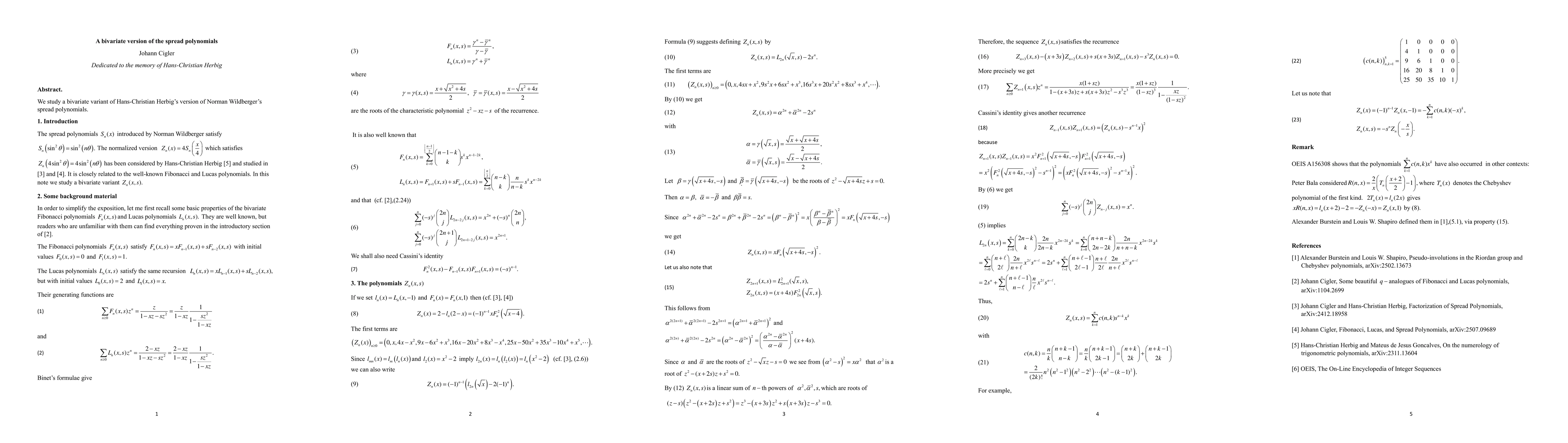 We study a bivariate variant of Hans-Christian Herbig's version of Norman Wildberger's spread polynomials.
